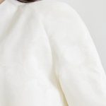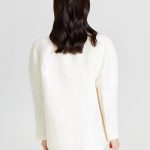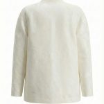 Модель свободного силуэта с длинными рукавами, воротником стойкой, без застежки. Жаккардовый узор в виде раковин создает фактурный акцент.