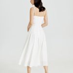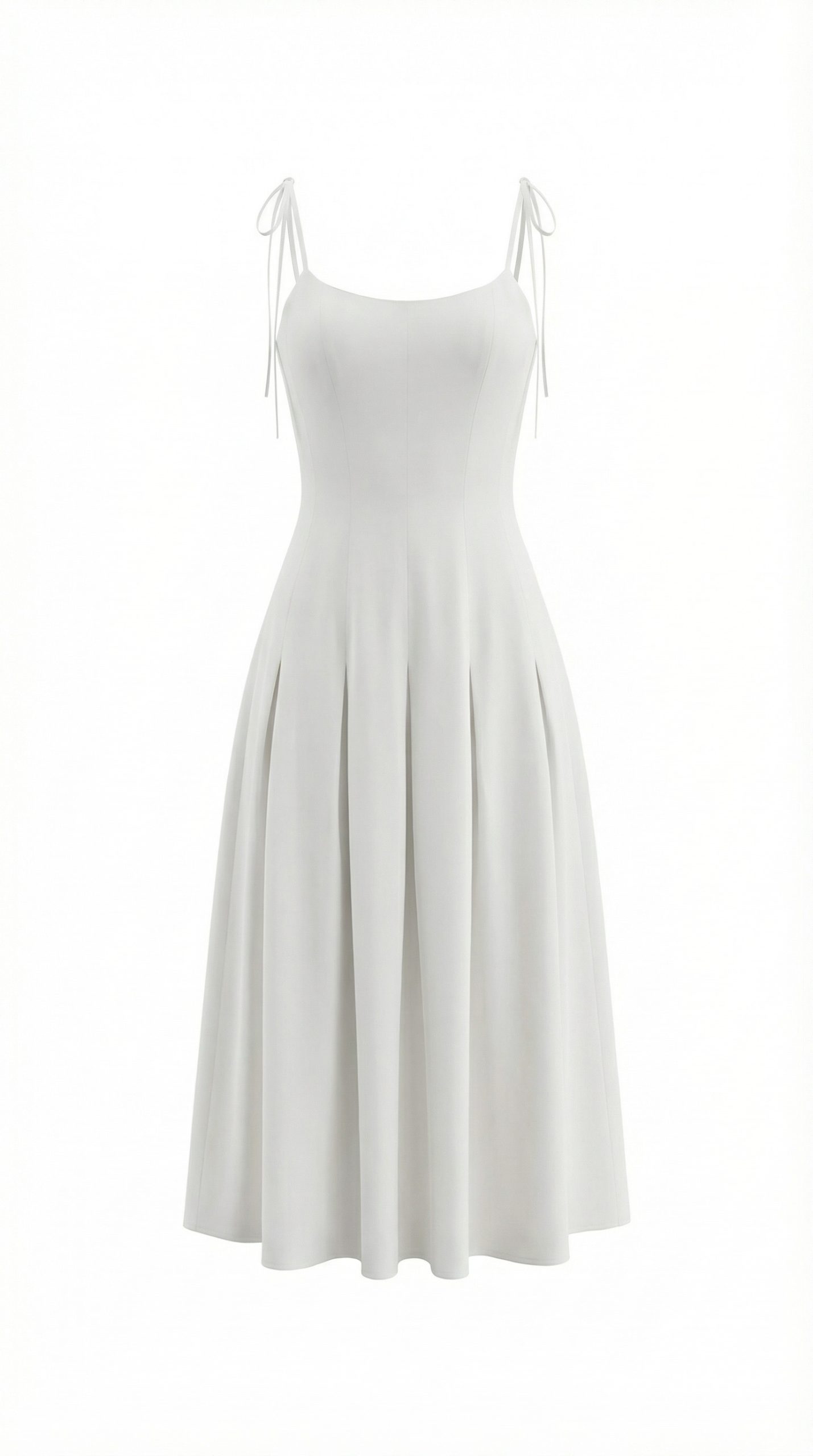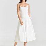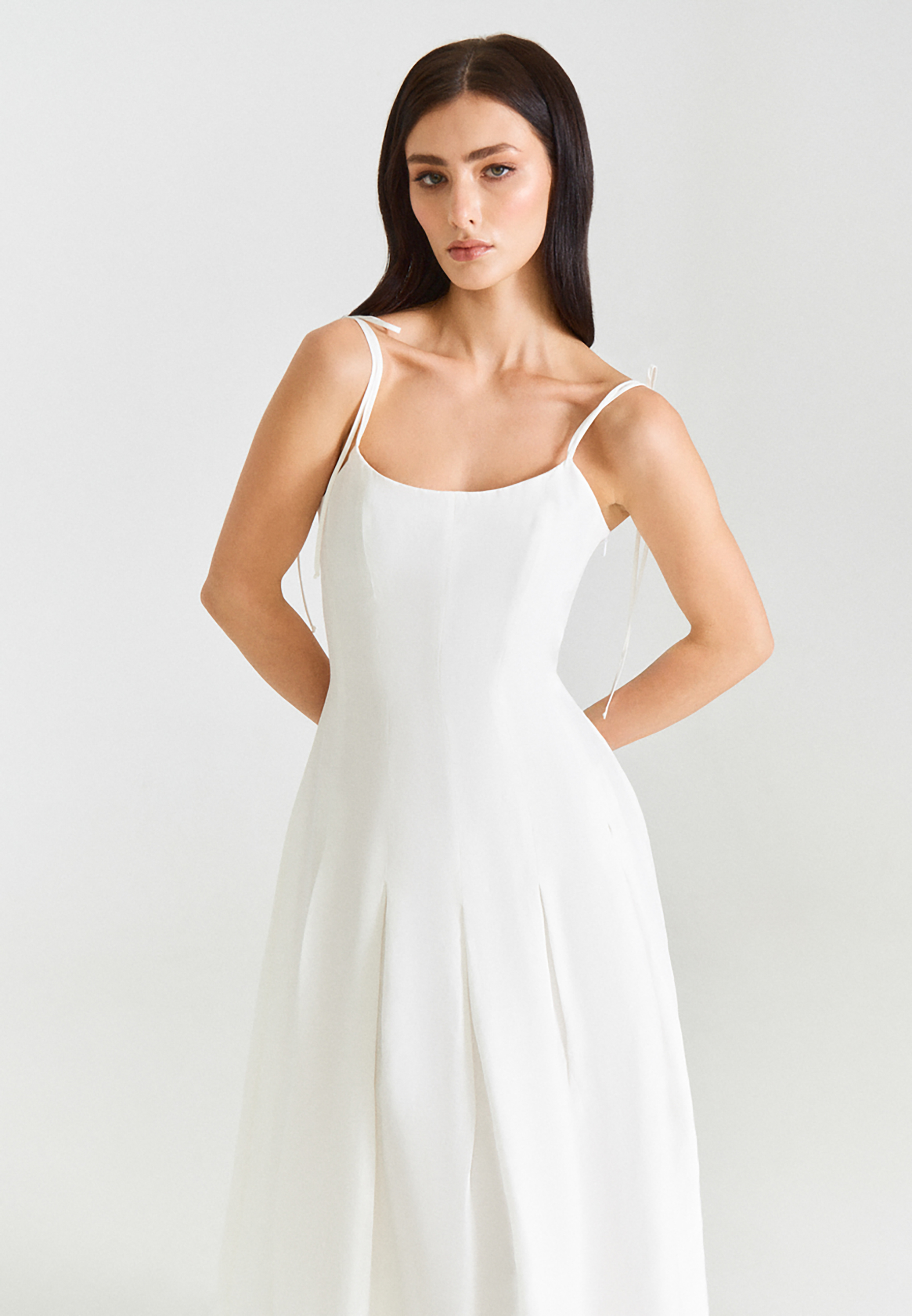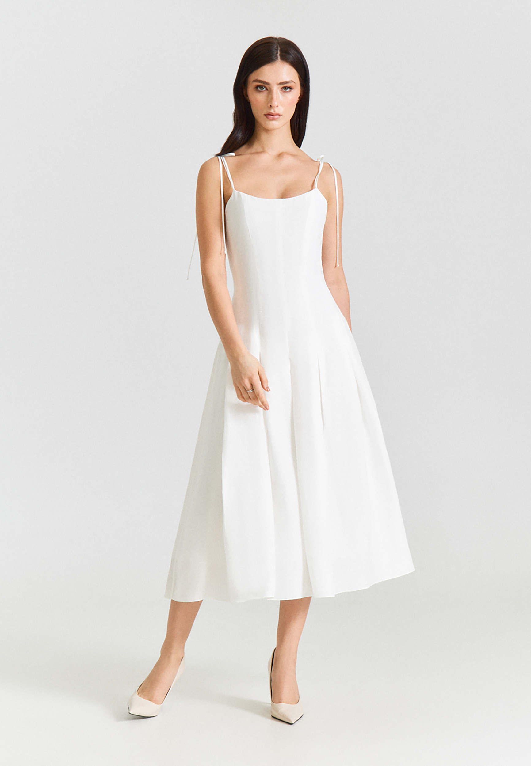 Модель приталенного силуэта с тонкими регулируемыми бретелями, расклешенной юбкой-миди с клиньями, застежкой на потайную молнию.