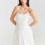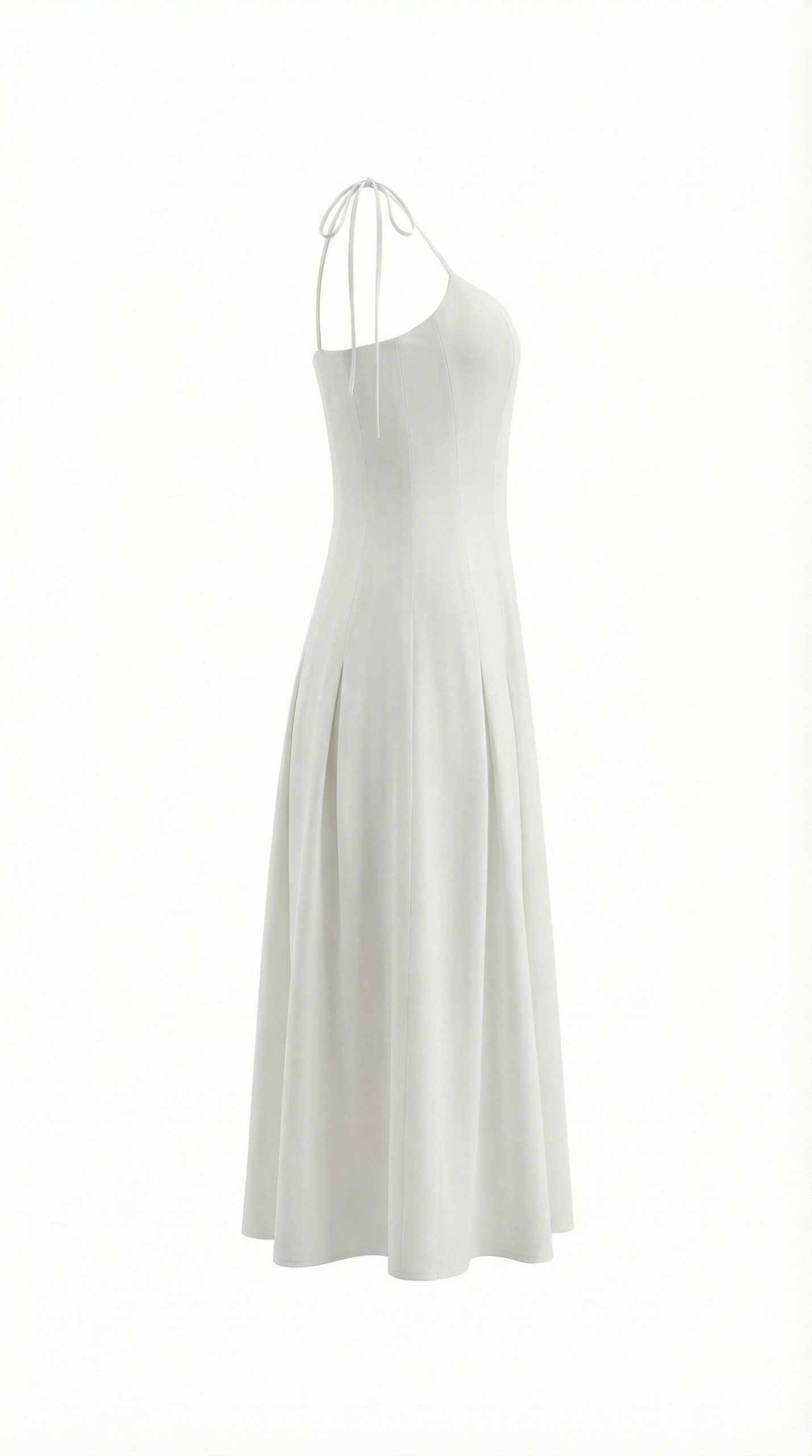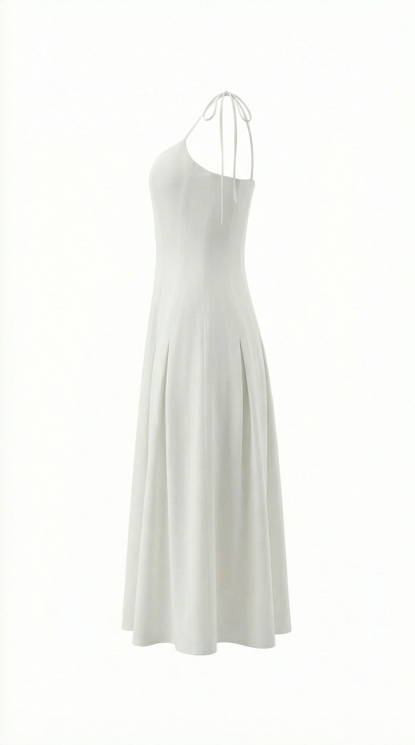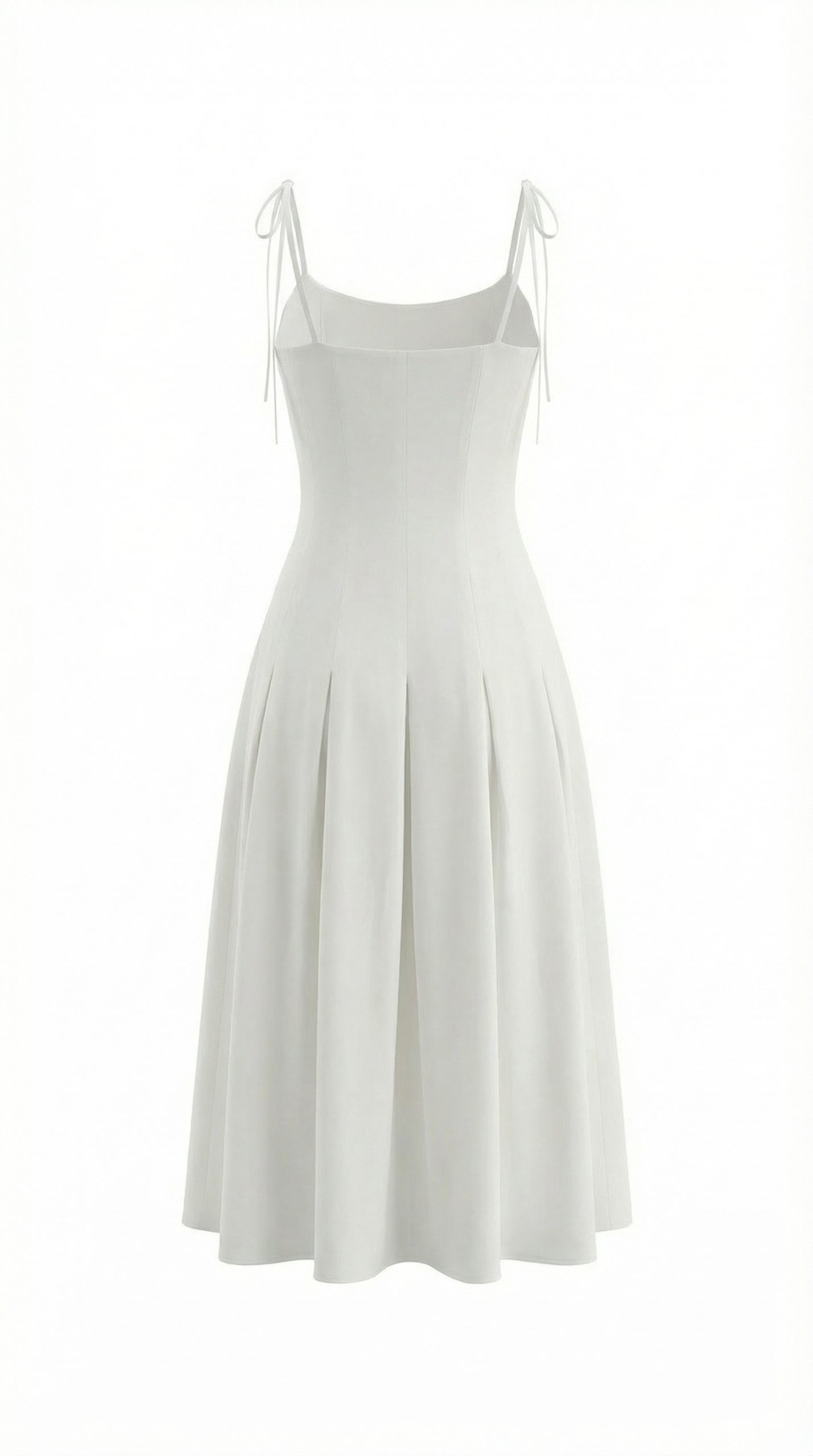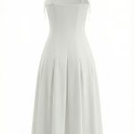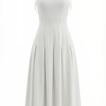 Модель приталенного силуэта с тонкими регулируемыми бретелями, расклешенной юбкой-миди с клиньями, застежкой на потайную молнию.