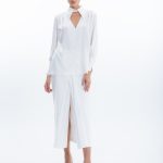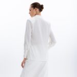 Модель приталенного силуэта с длинными рукавами, дизайнерским отложным воротником, специальным разрезом на манжете рукава, который придает образу особый шик и застежкой на пуговицы.