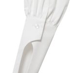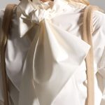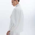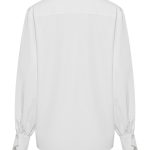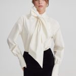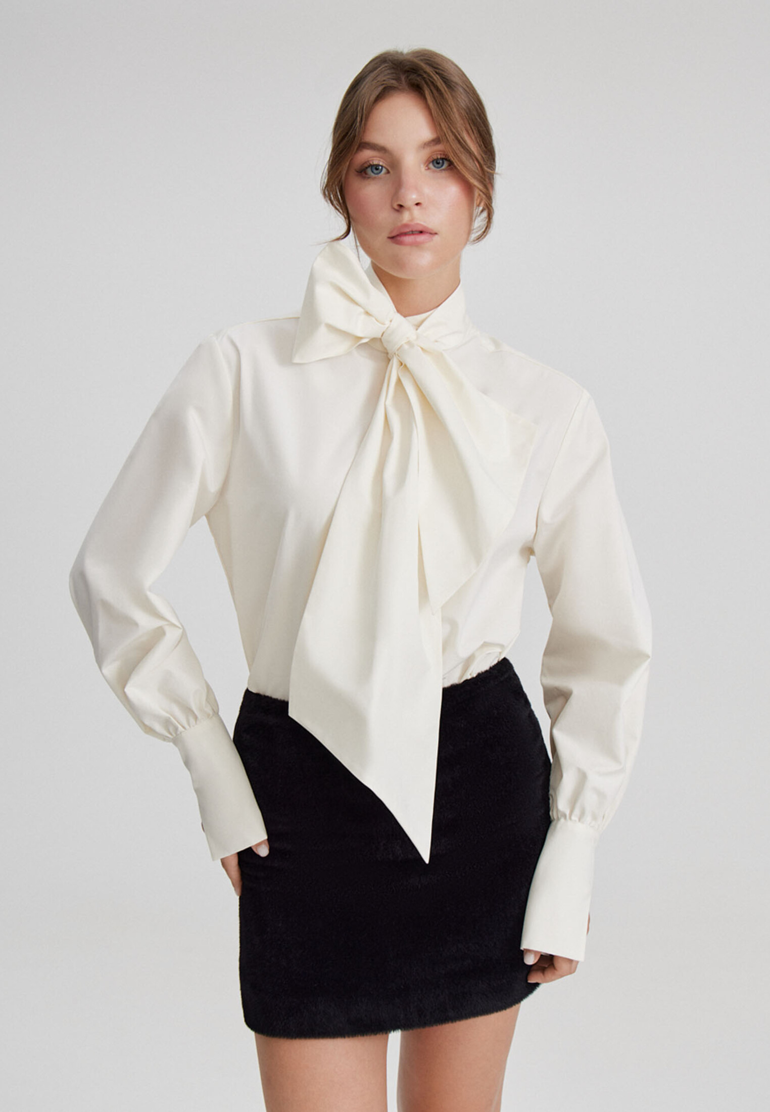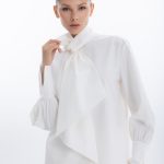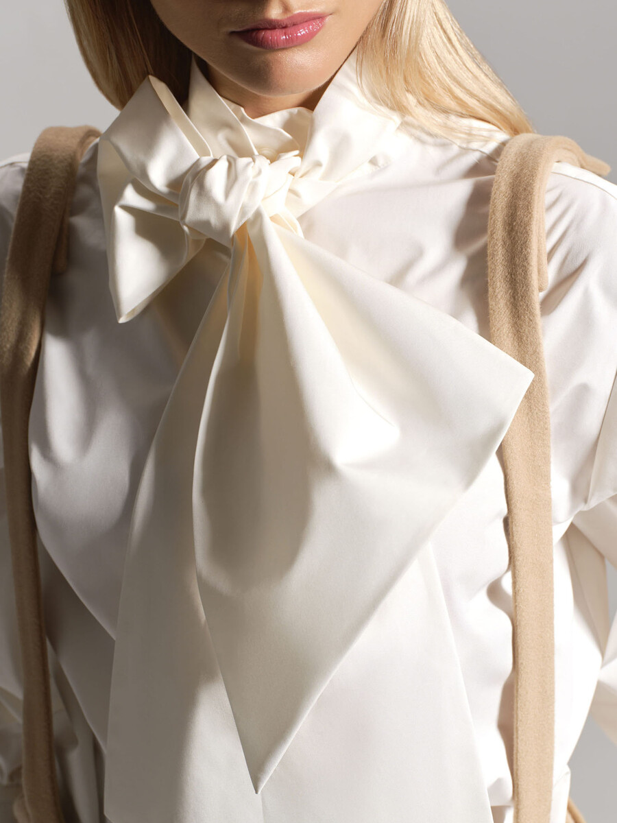 Модель свободного силуэта с длинными рукавами, дизайнерской стойкой воротника и удлиненным бантом, специальным разрезом на манжете рукава, который придает образу особый шик и застежкой на пуговицы.