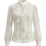 Модель свободного силуэта с длинными рукавами, дизайнерской стойкой воротника, удлиненным бантом и застежкой на пуговицы. Жаккардовый узор в виде цветов придает образу особый шик.