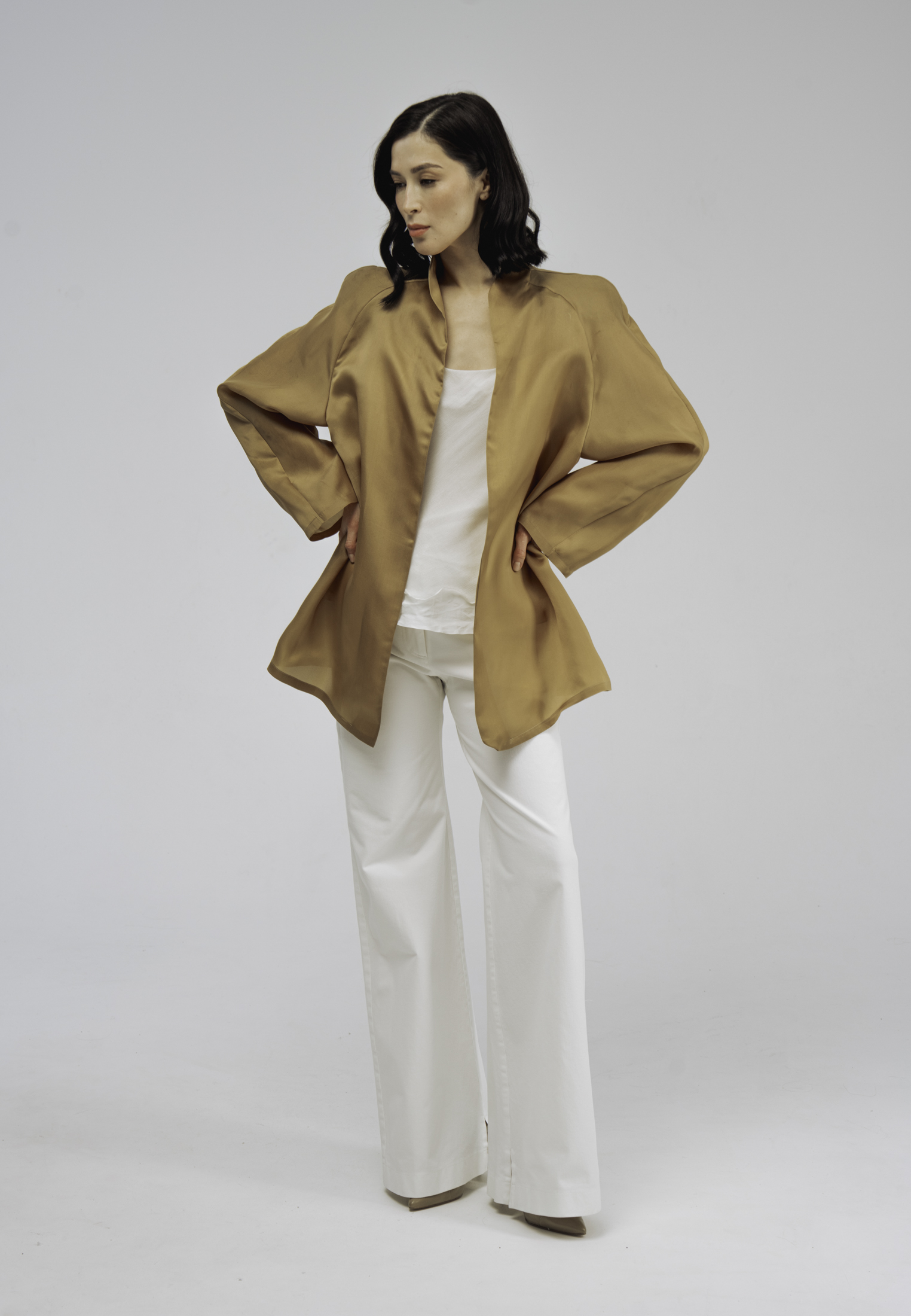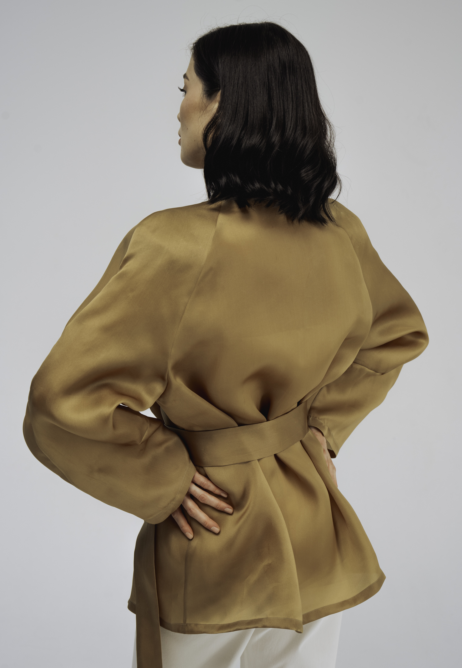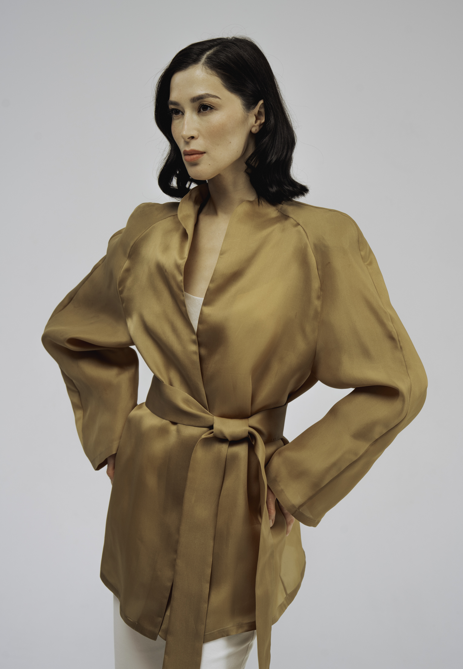 Куртка-кимоно из шелка золотистого цвета.