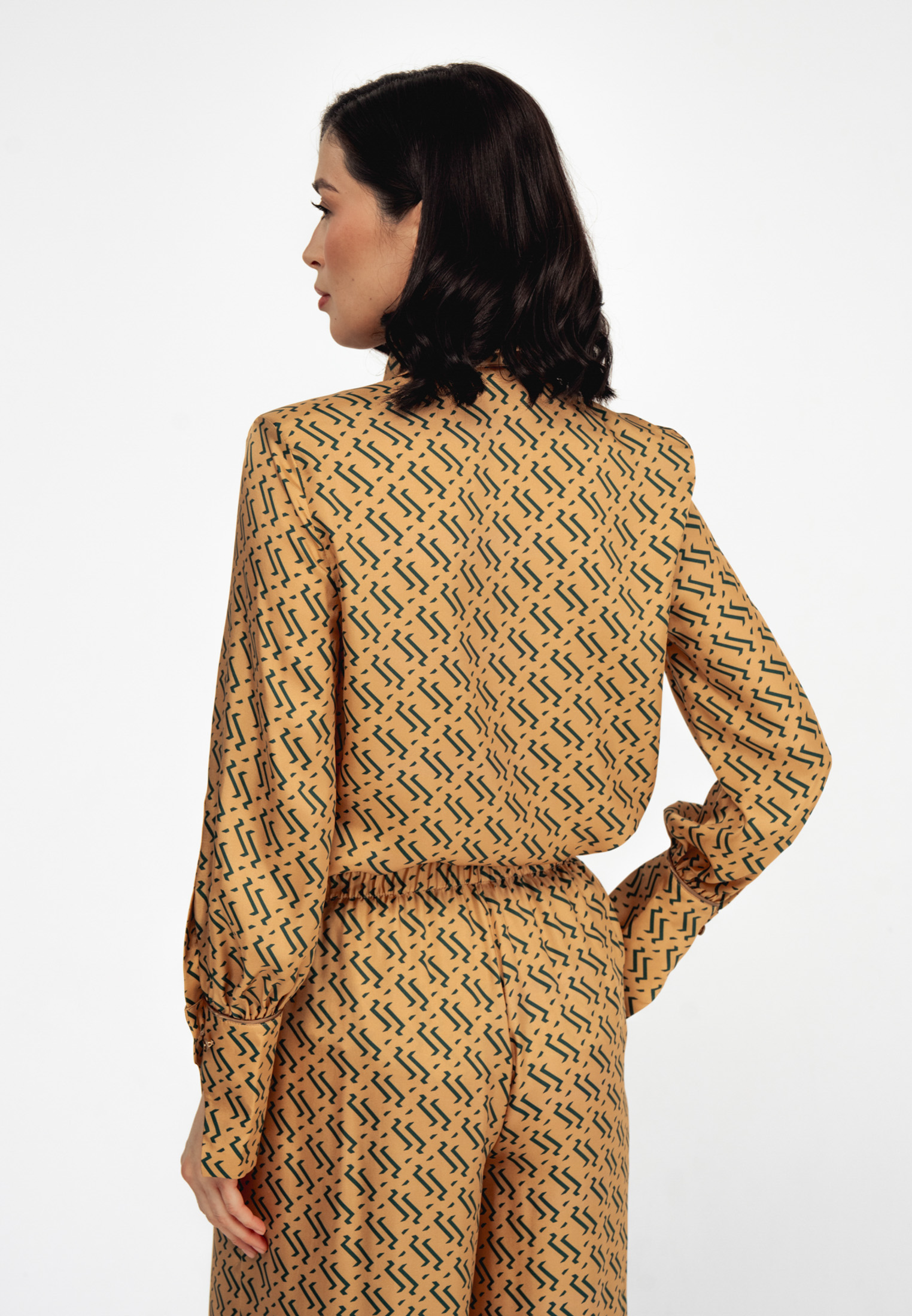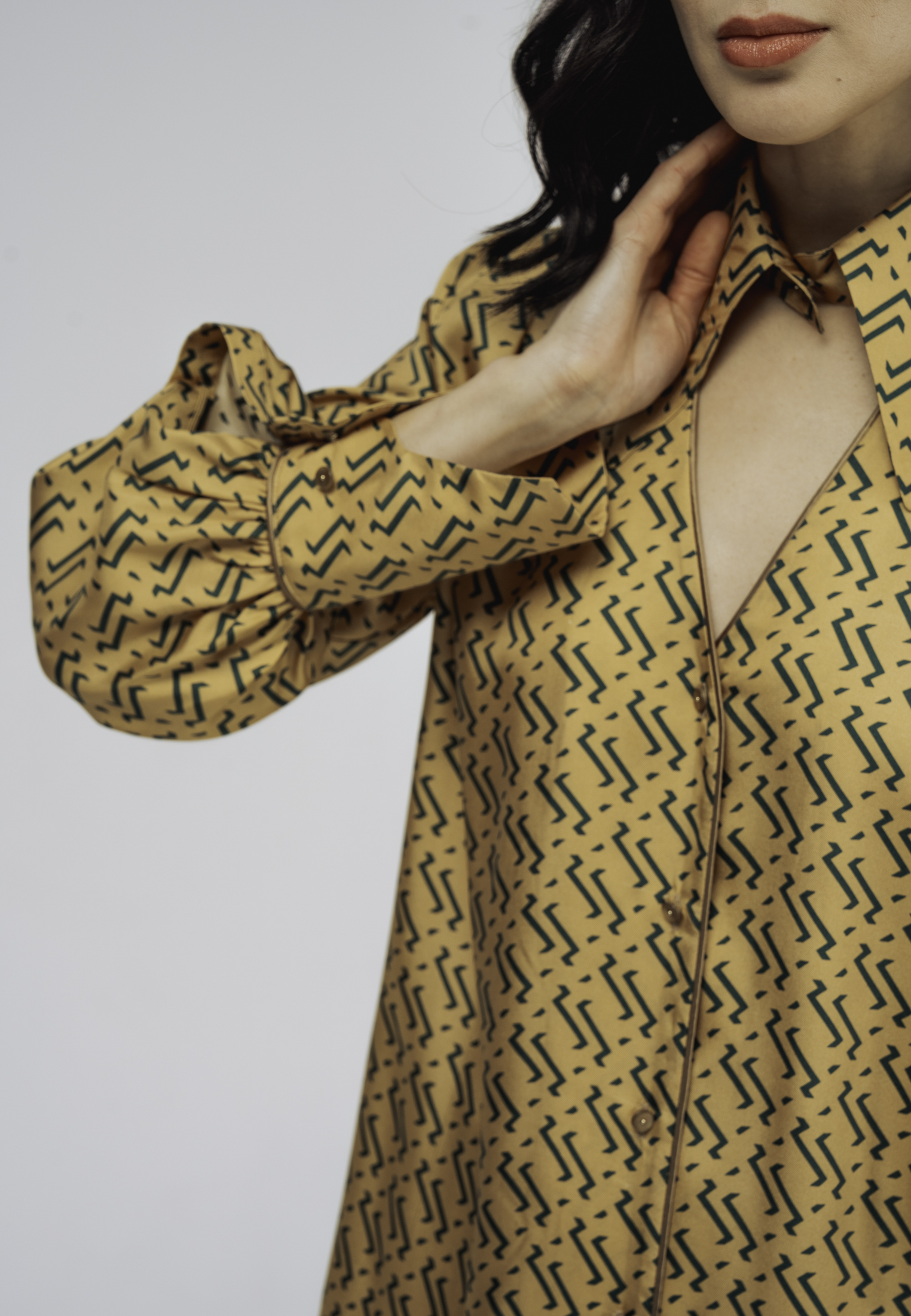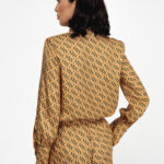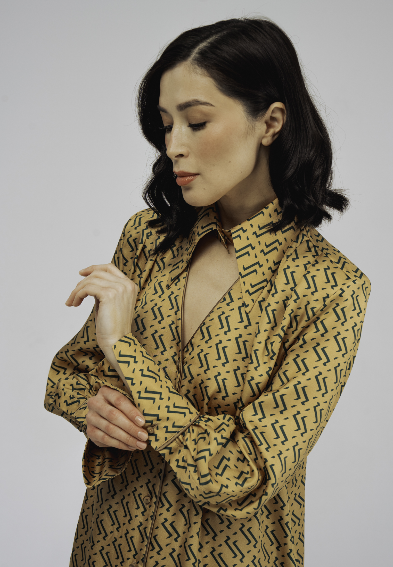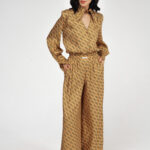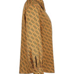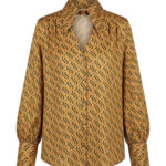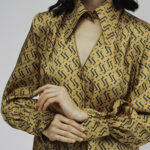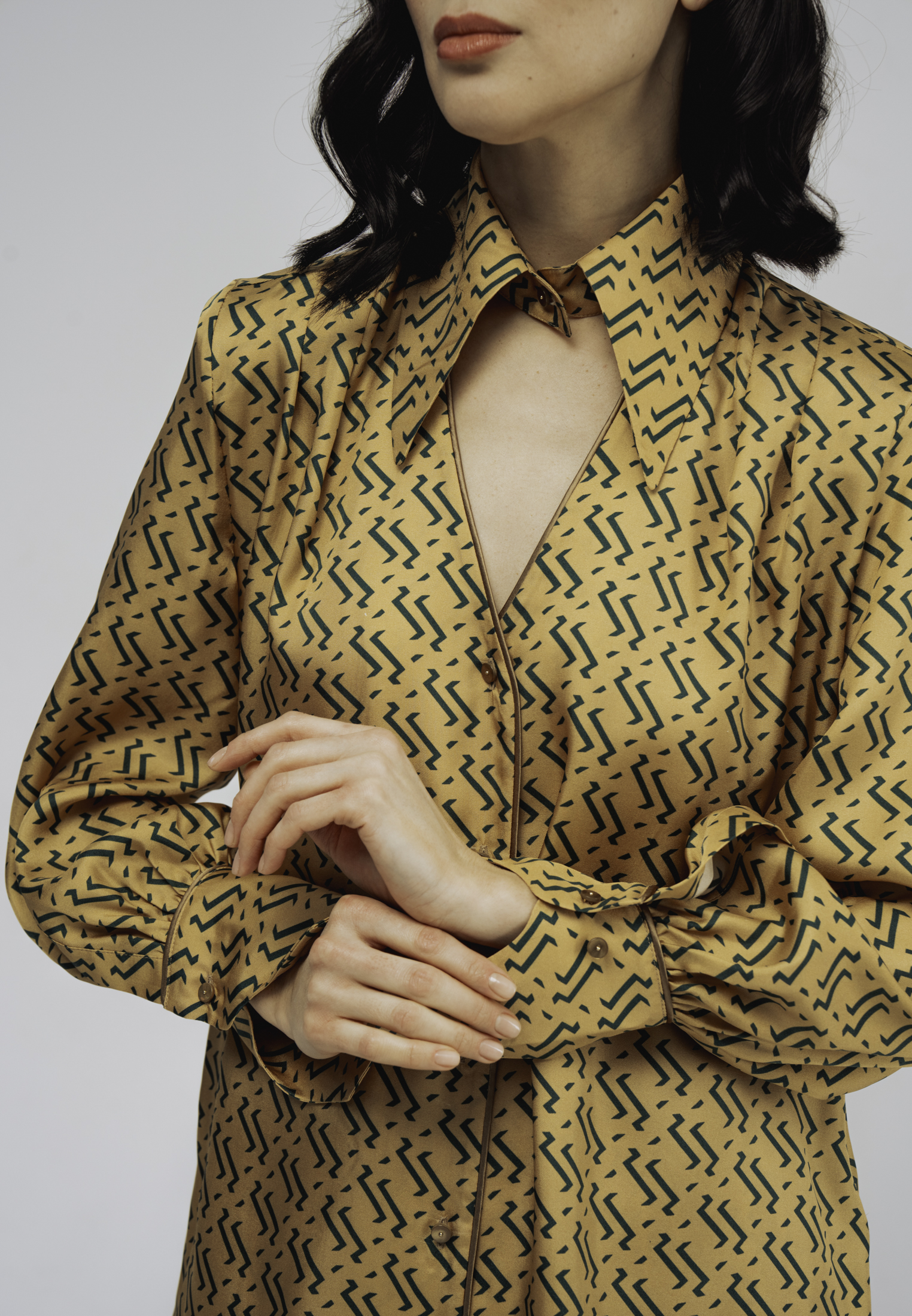 Блуза золотого цвета с из натурального шелка с принтом в виде волн.