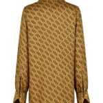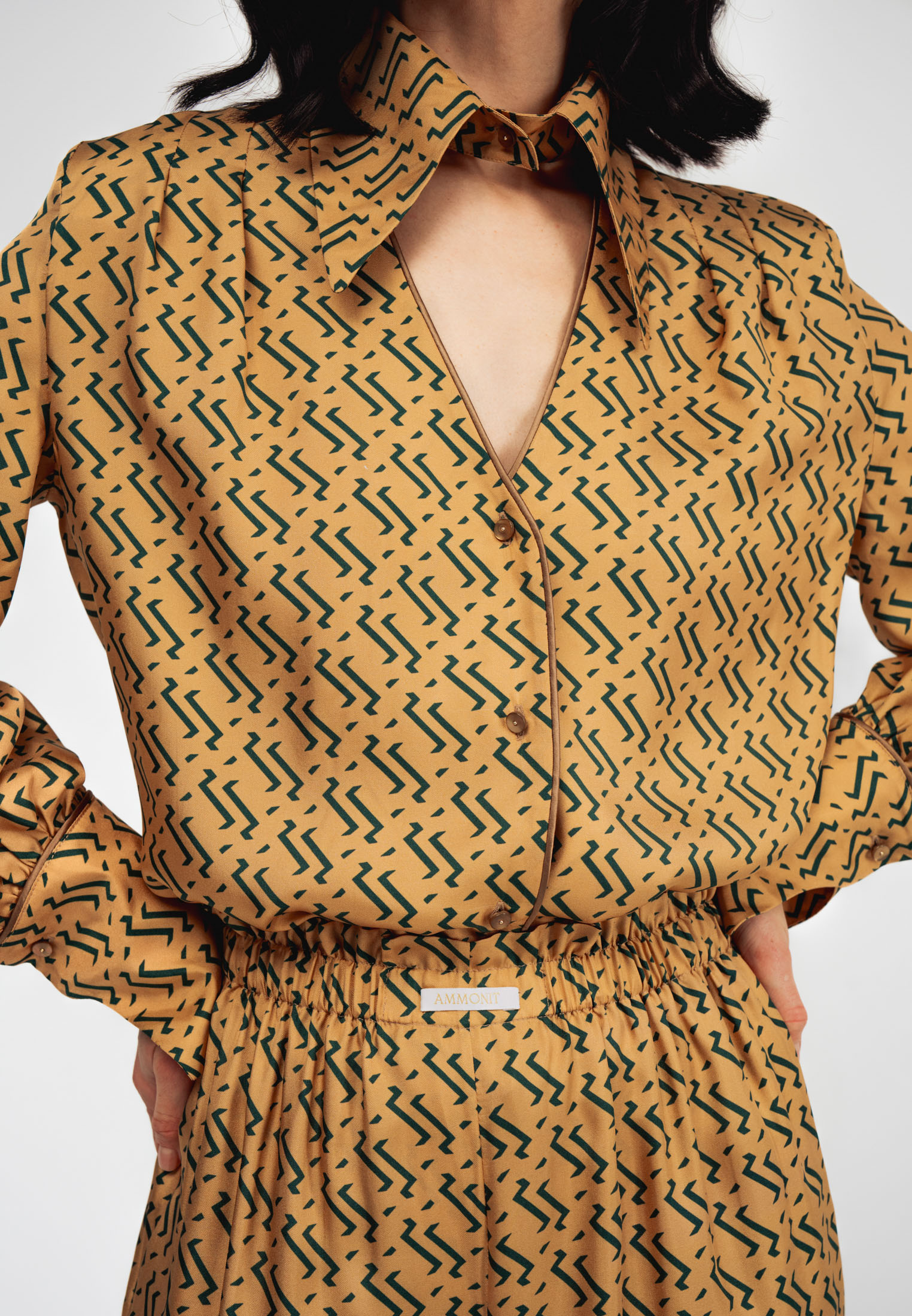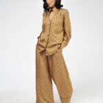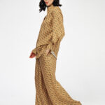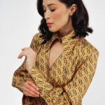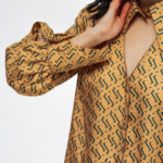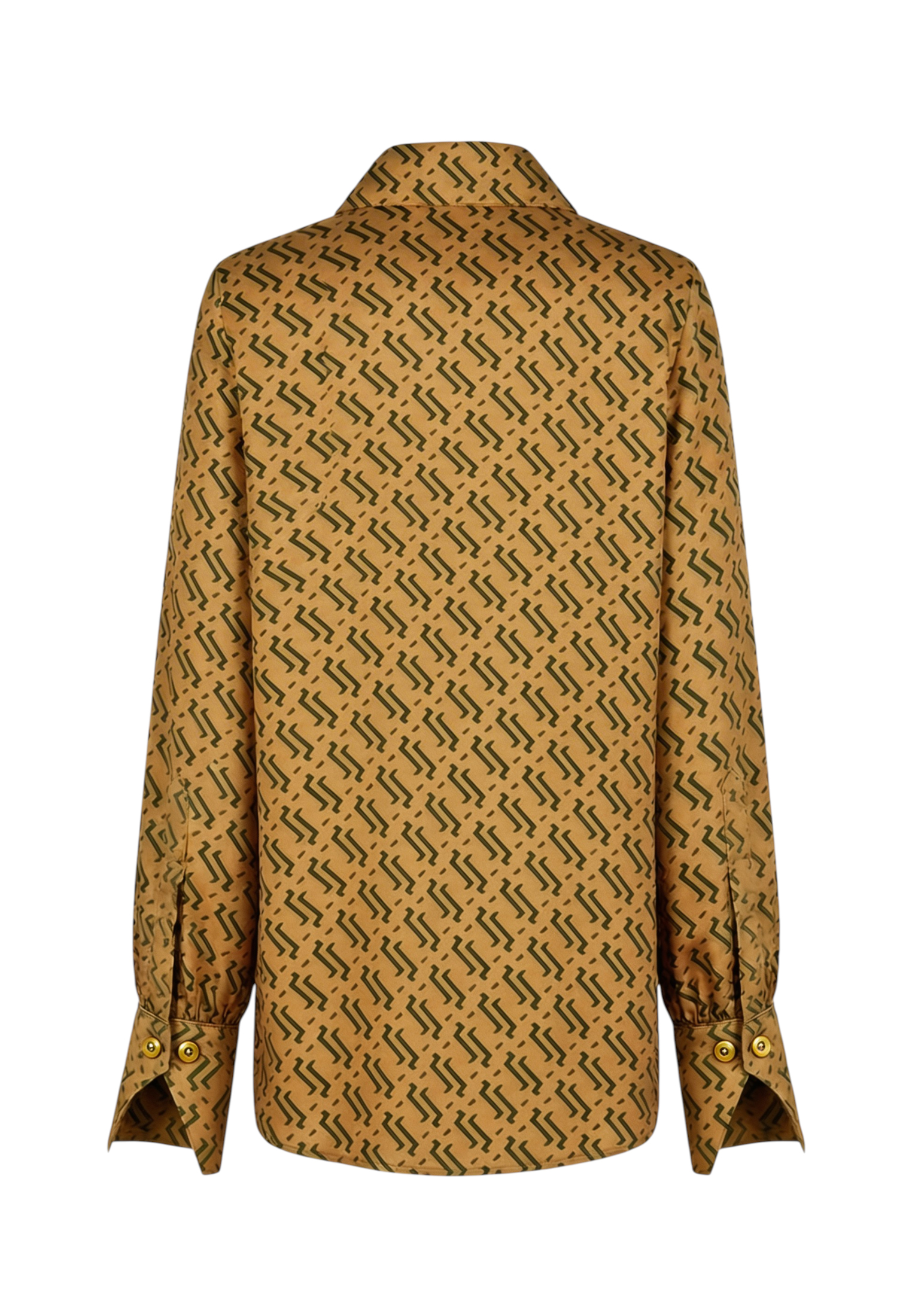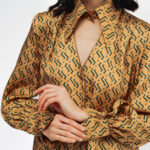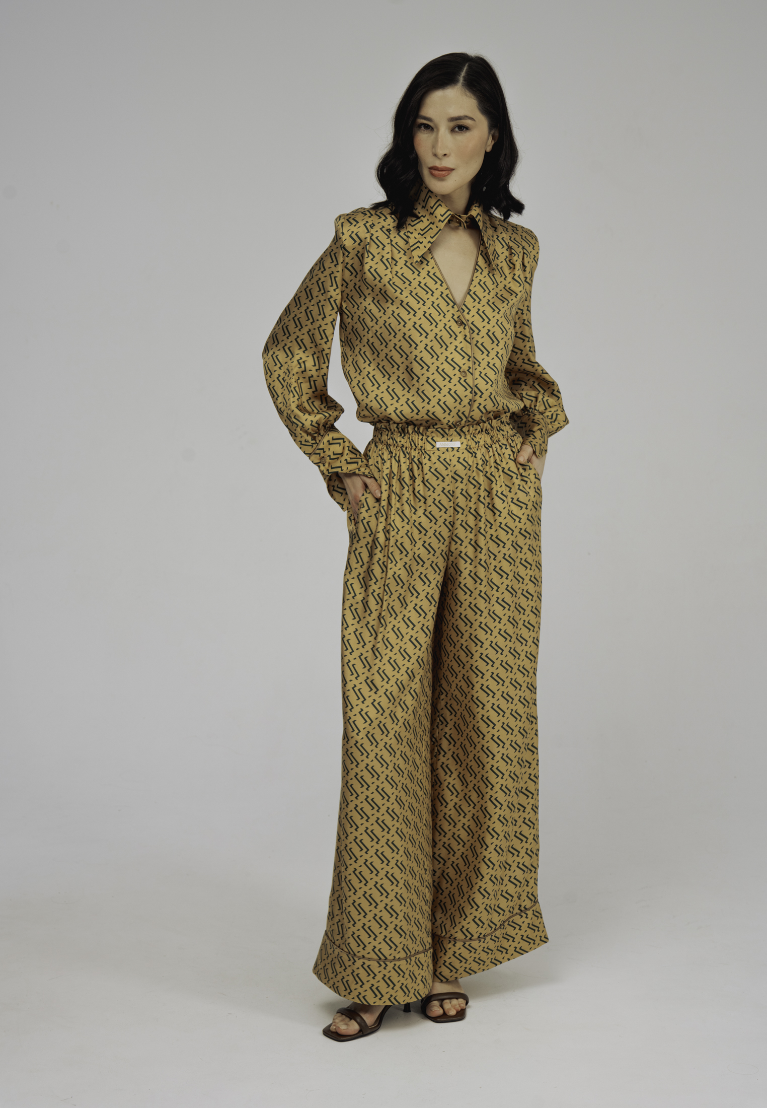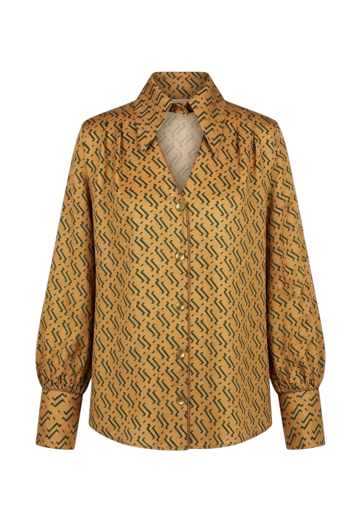 Блуза золотого цвета с из натурального шелка с принтом в виде волн.