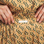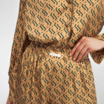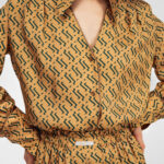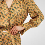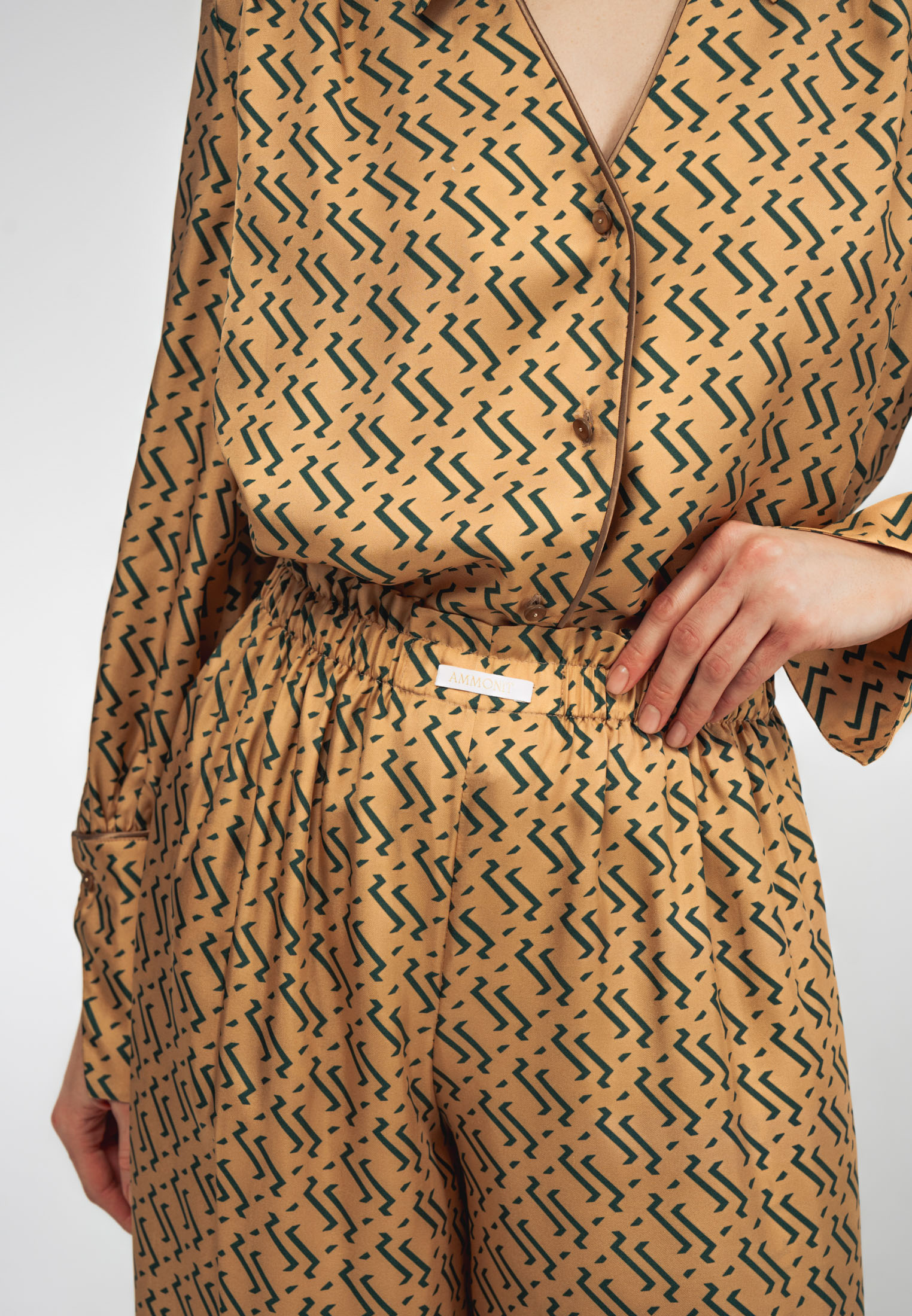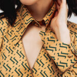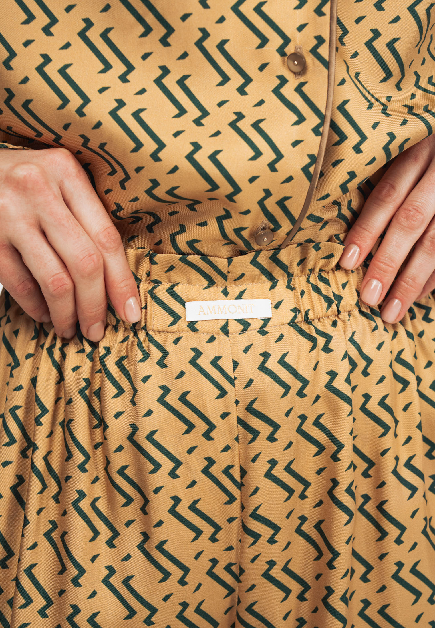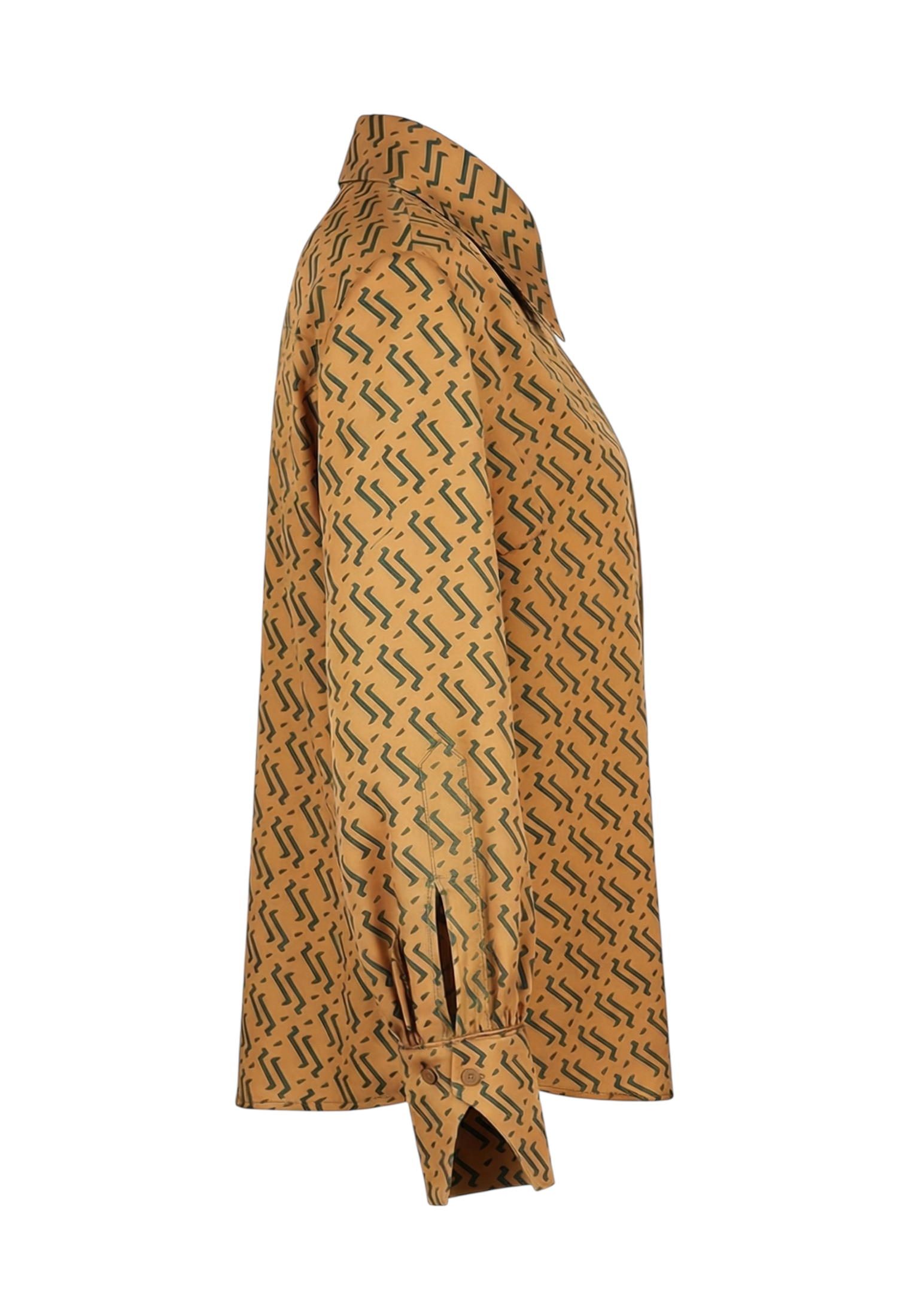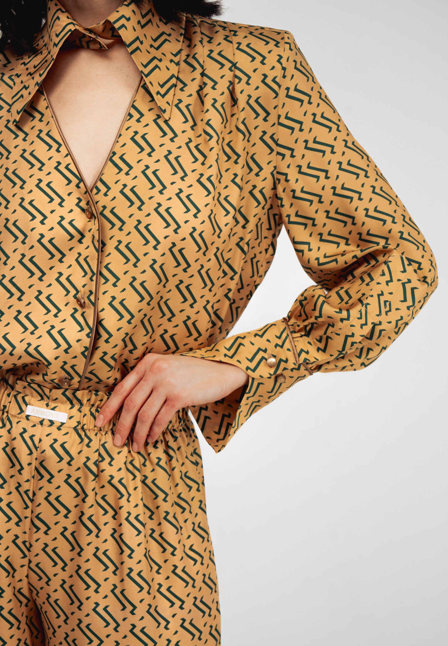 Блуза золотого цвета с из натурального шелка с принтом в виде волн.