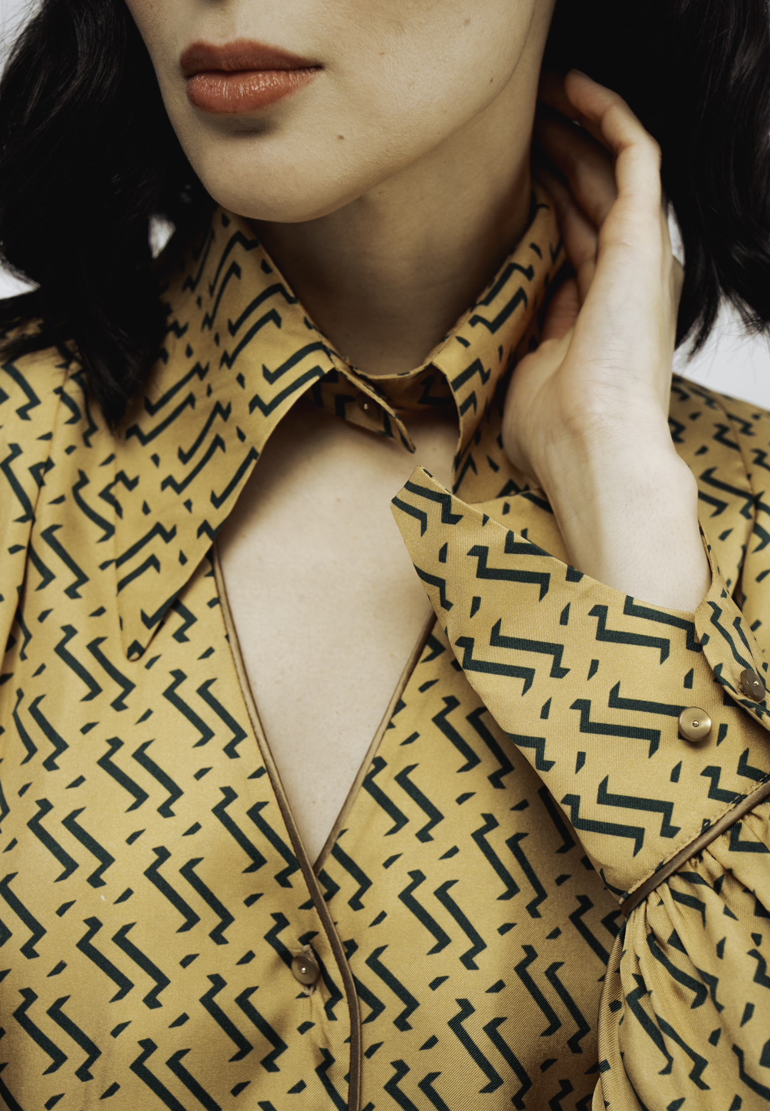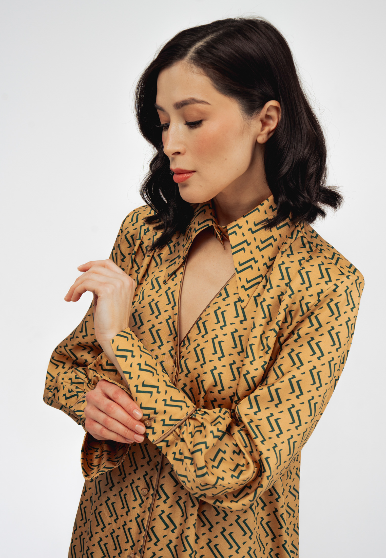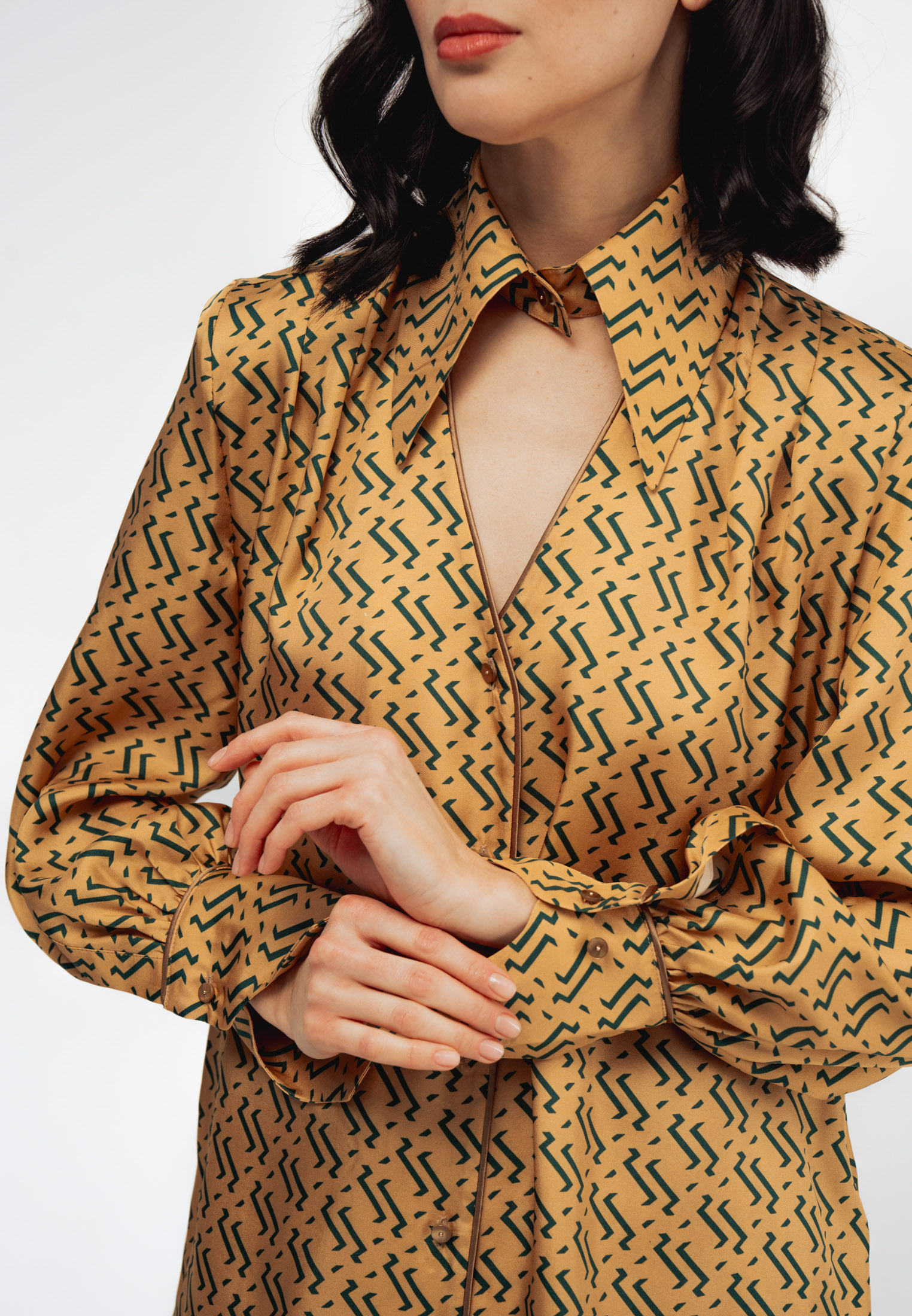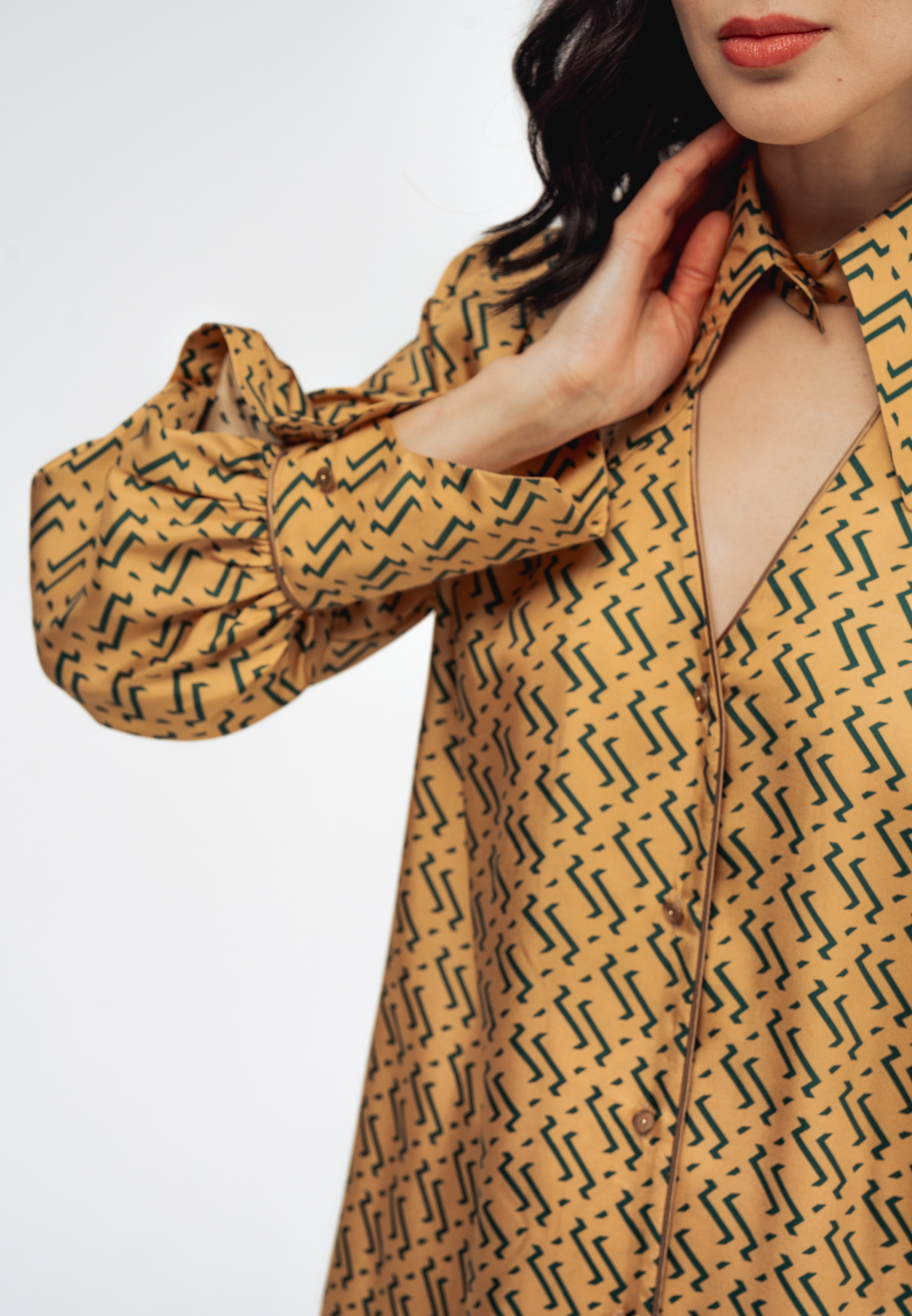 Модель свободного силуэта с длинными рукавами, дизайнерским отложным воротником и застежкой на пуговицы. Специальные разрезы на манжетах придают образу особый шик.