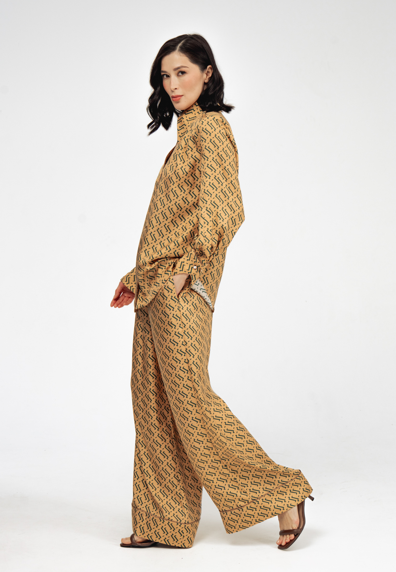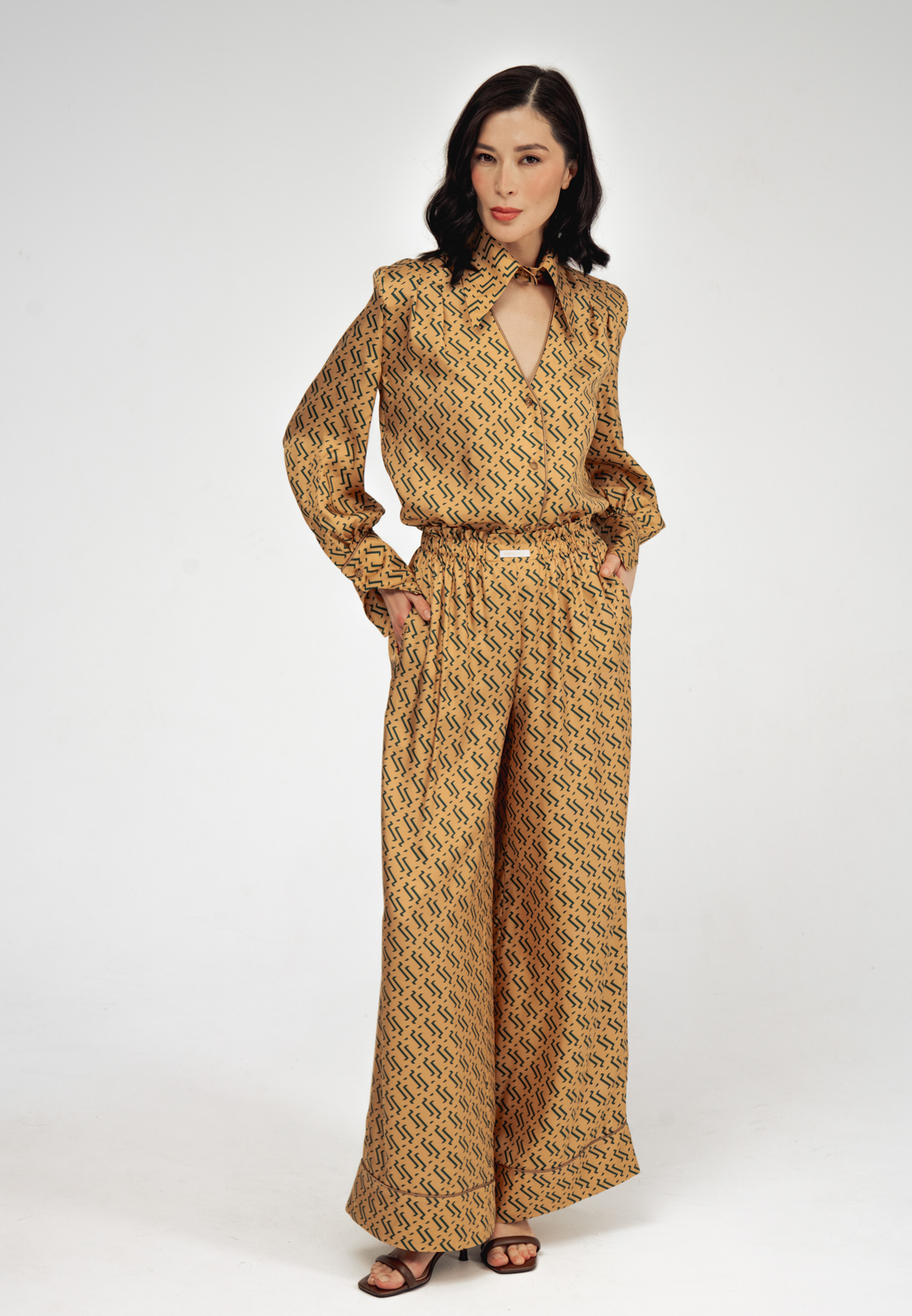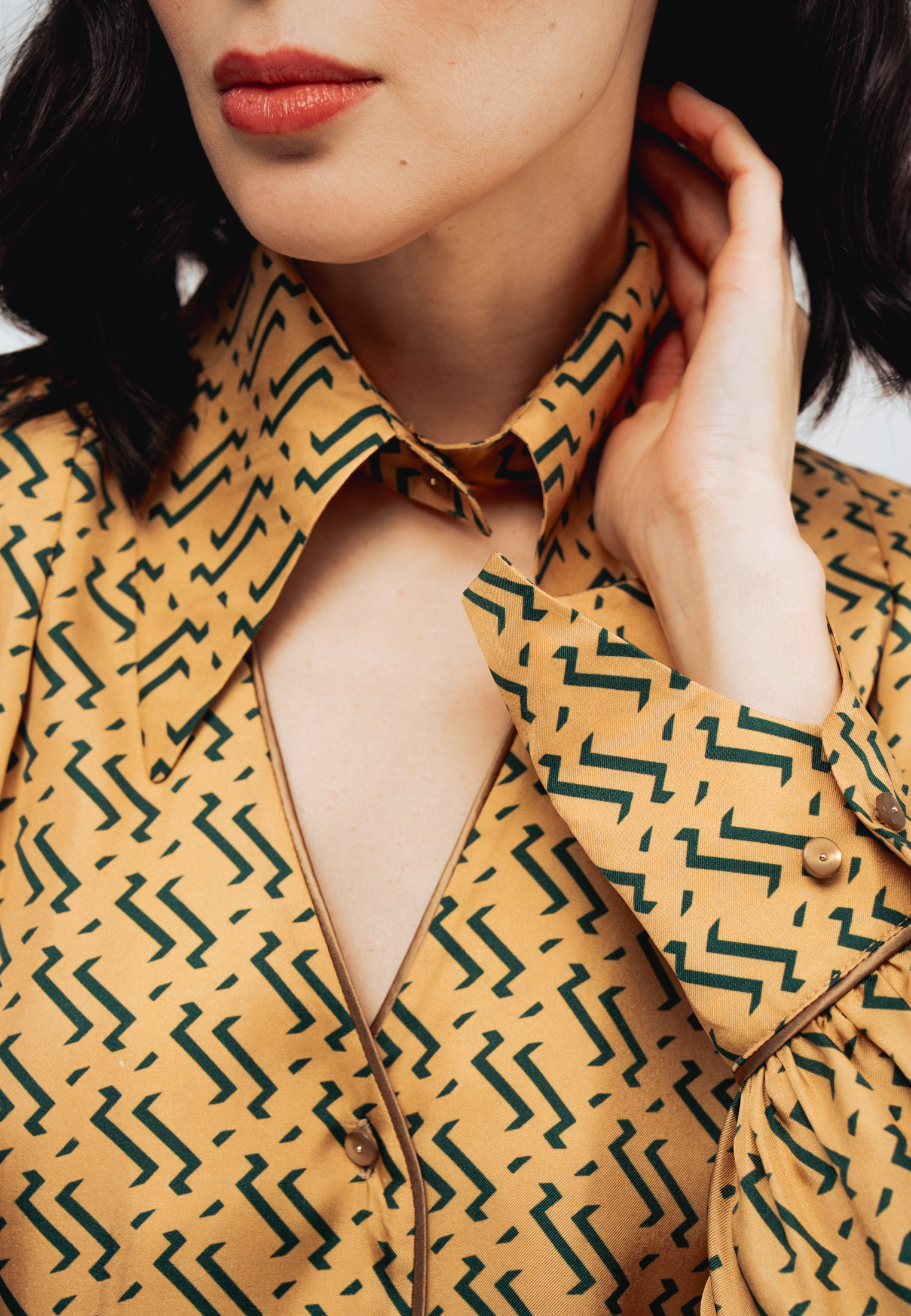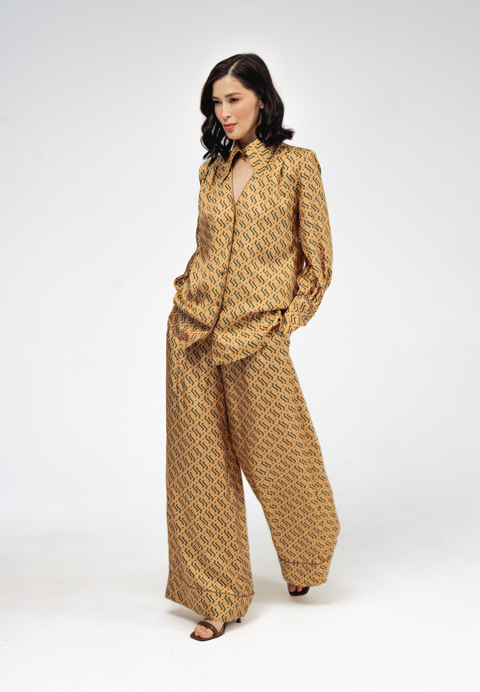 Модель свободного силуэта с длинными рукавами, дизайнерским отложным воротником и застежкой на пуговицы. Специальные разрезы на манжетах придают образу особый шик.