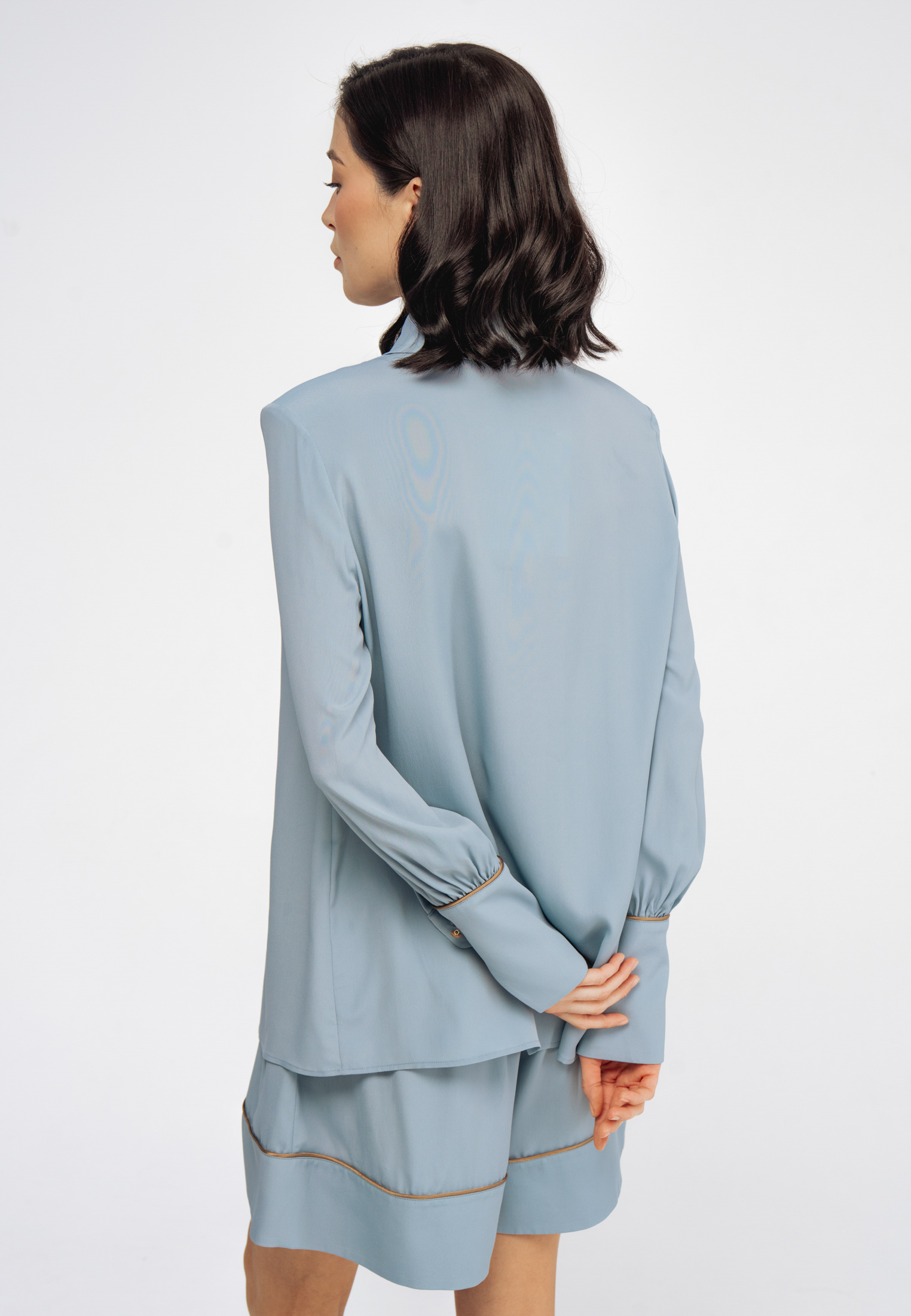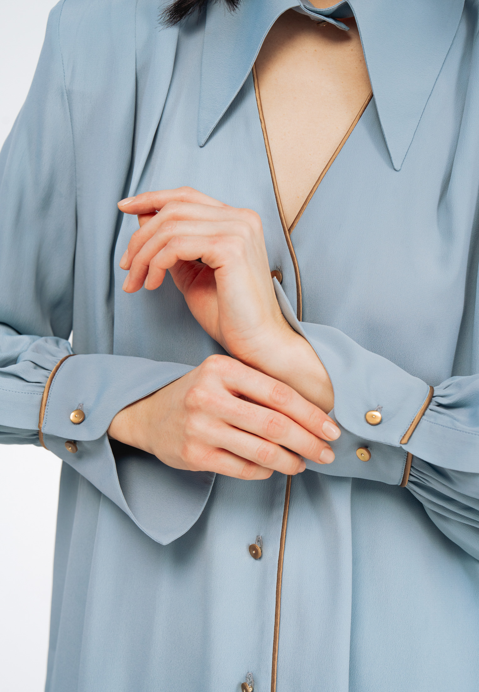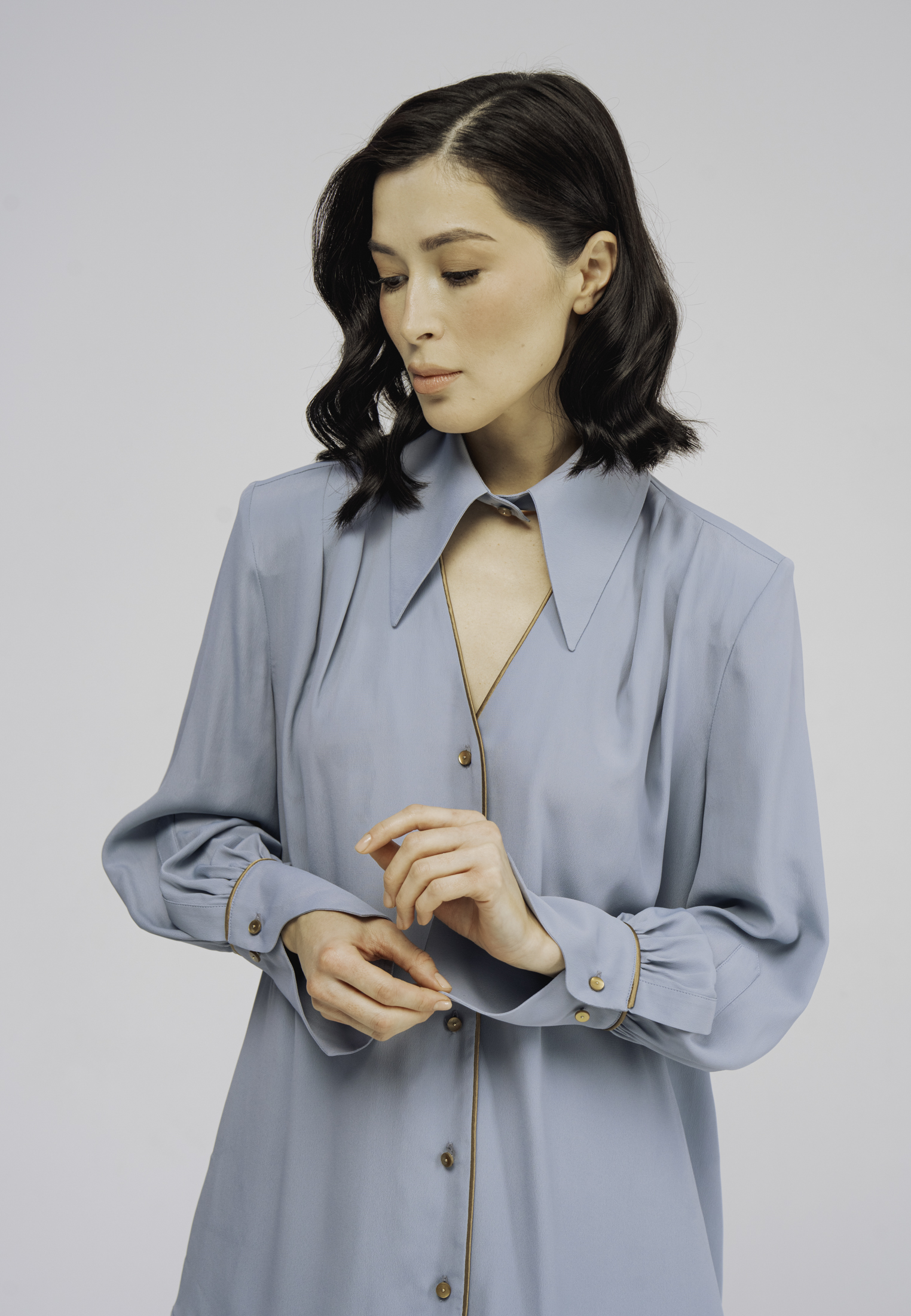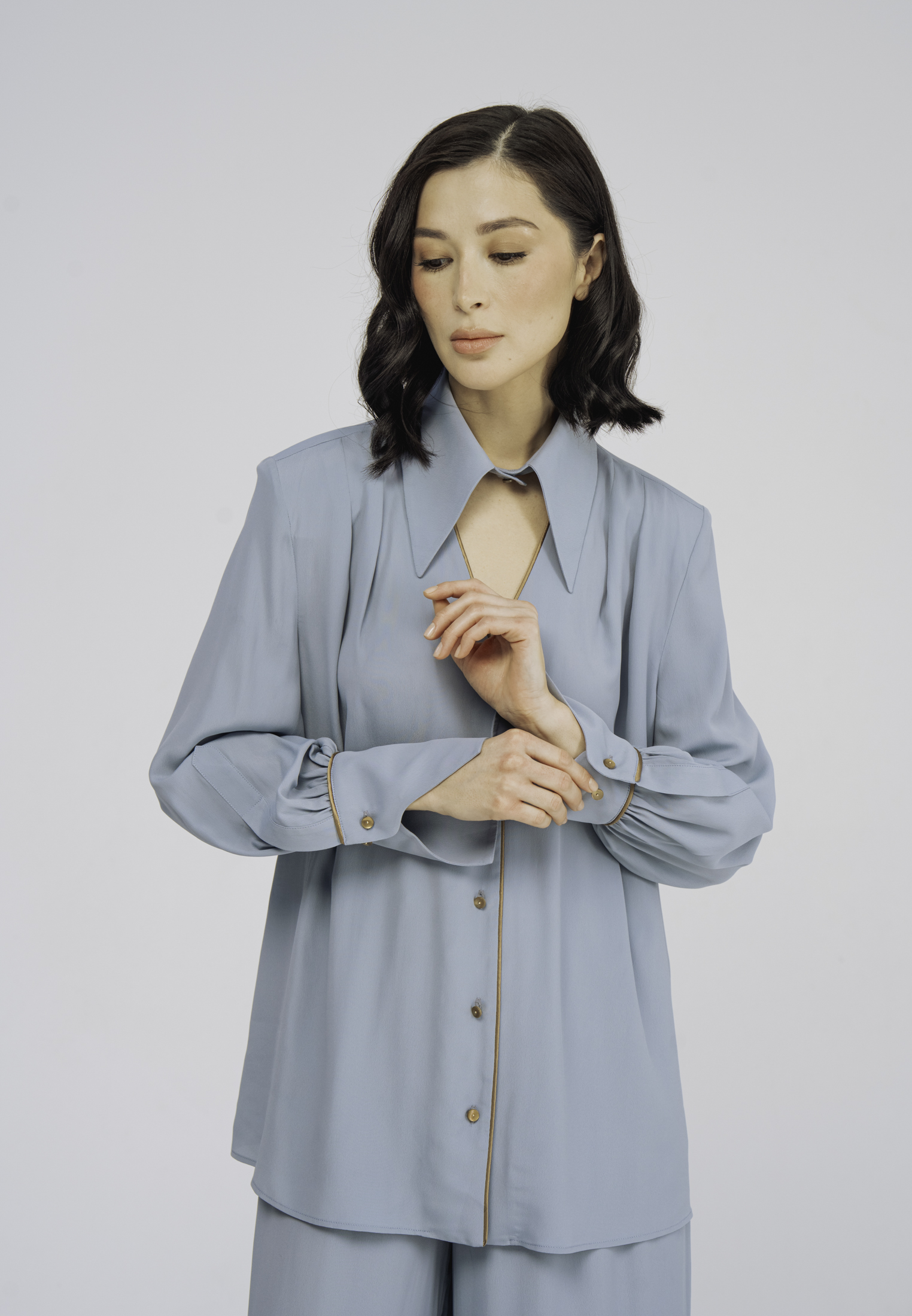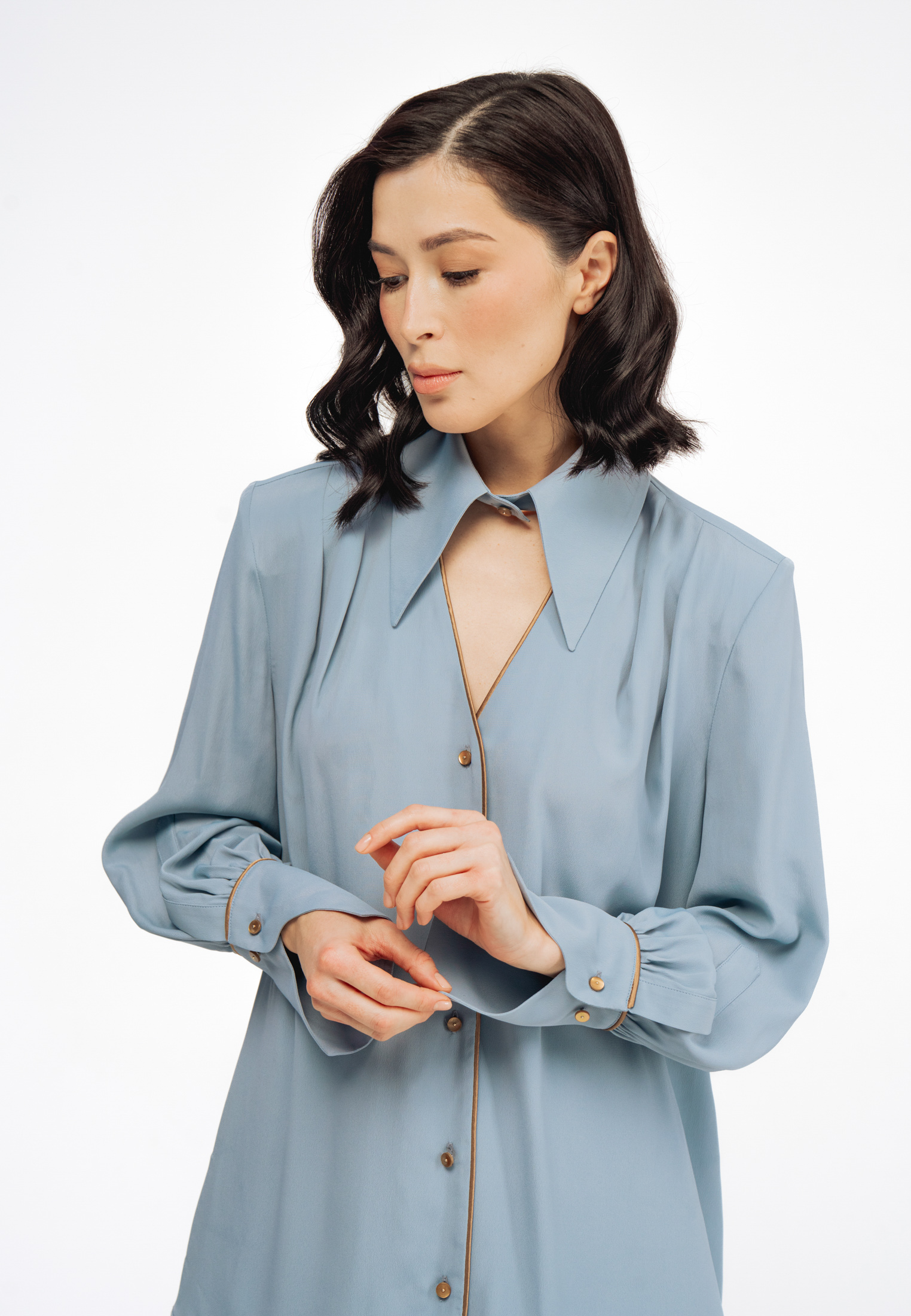 Модель свободного силуэта с длинными рукавами, дизайнерским отложным воротником и застежкой на пуговицы. Специальные разрезы на манжетах придают образу особый шик. Коричневая окантовка подчеркивает детали кроя.
