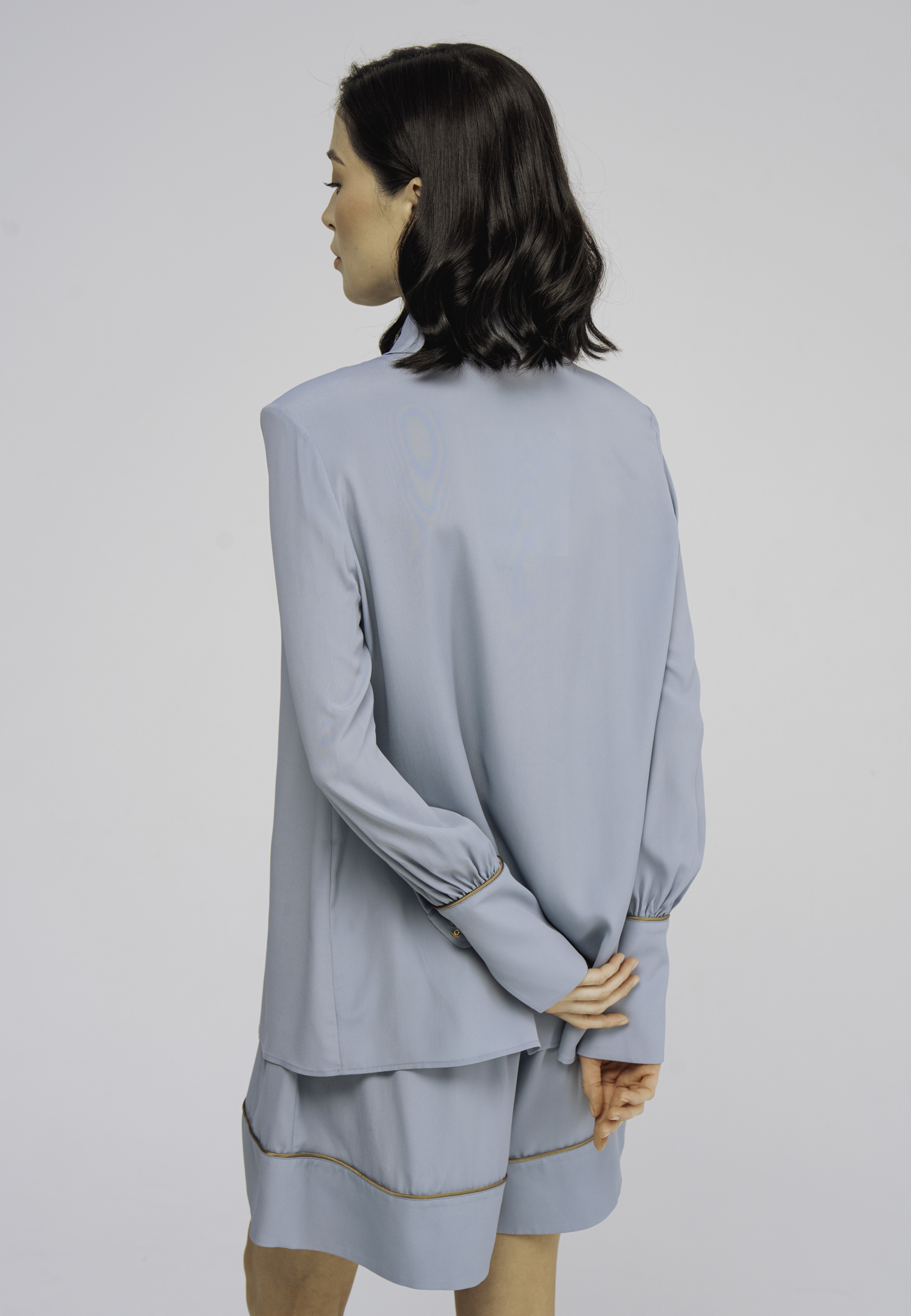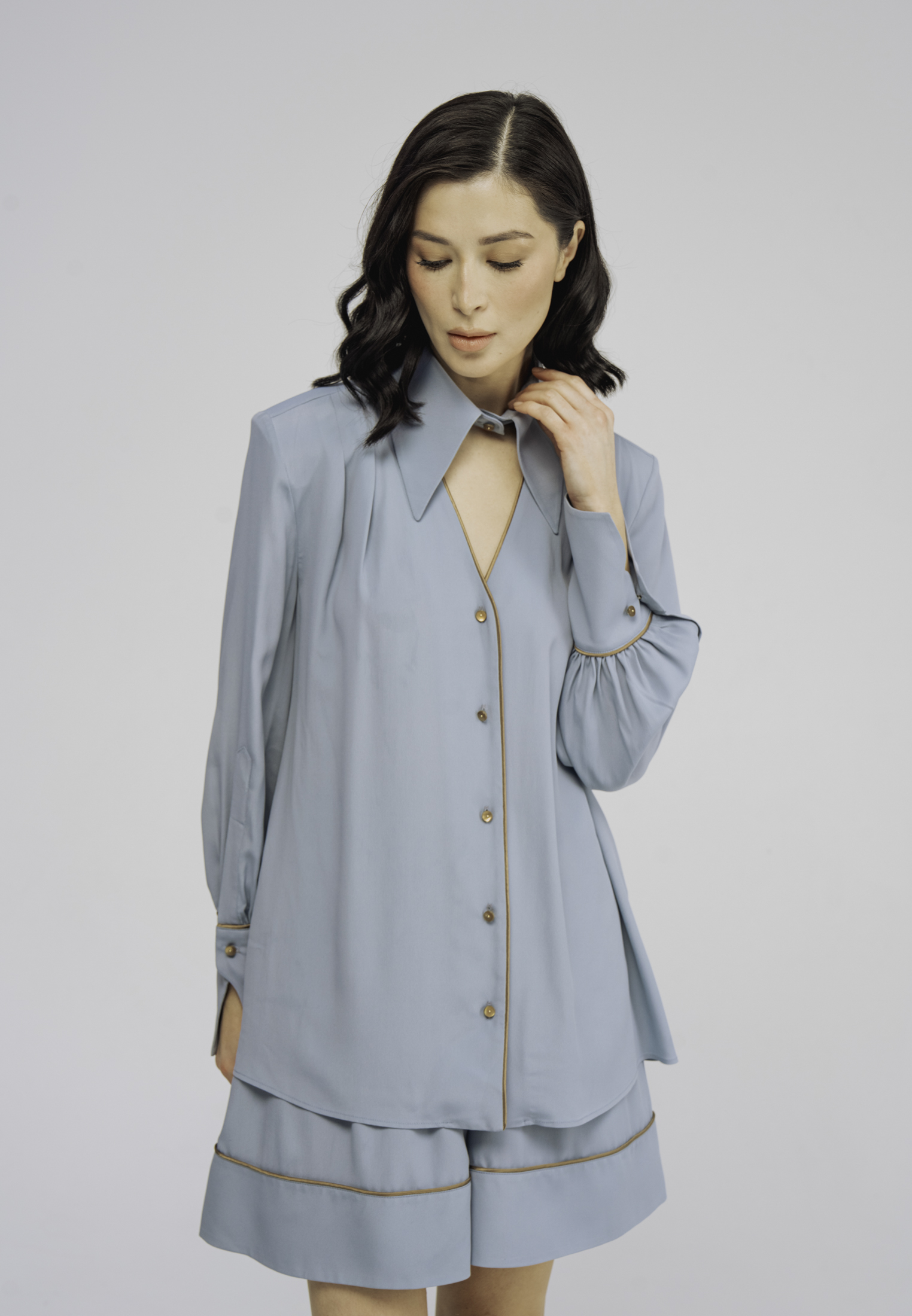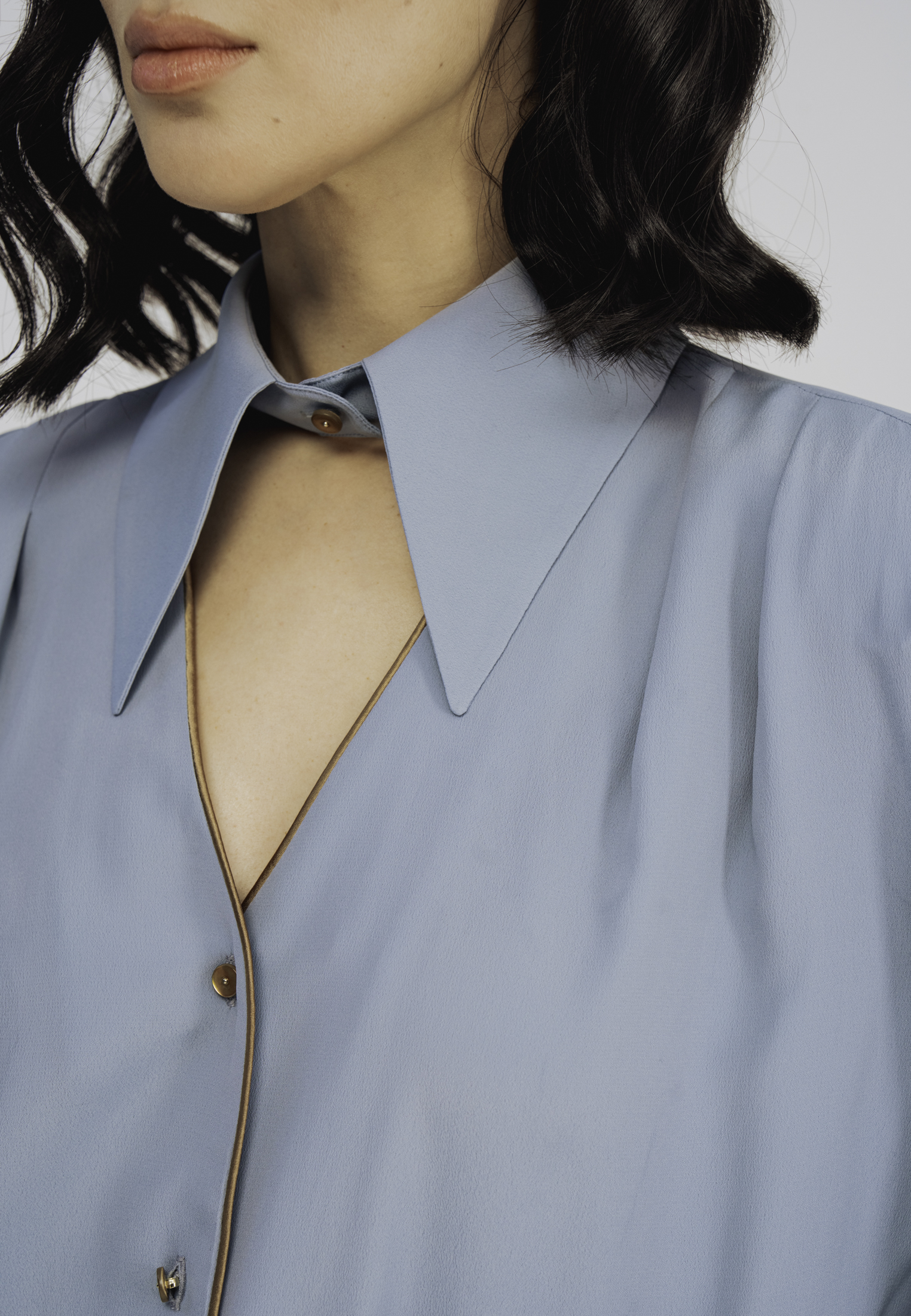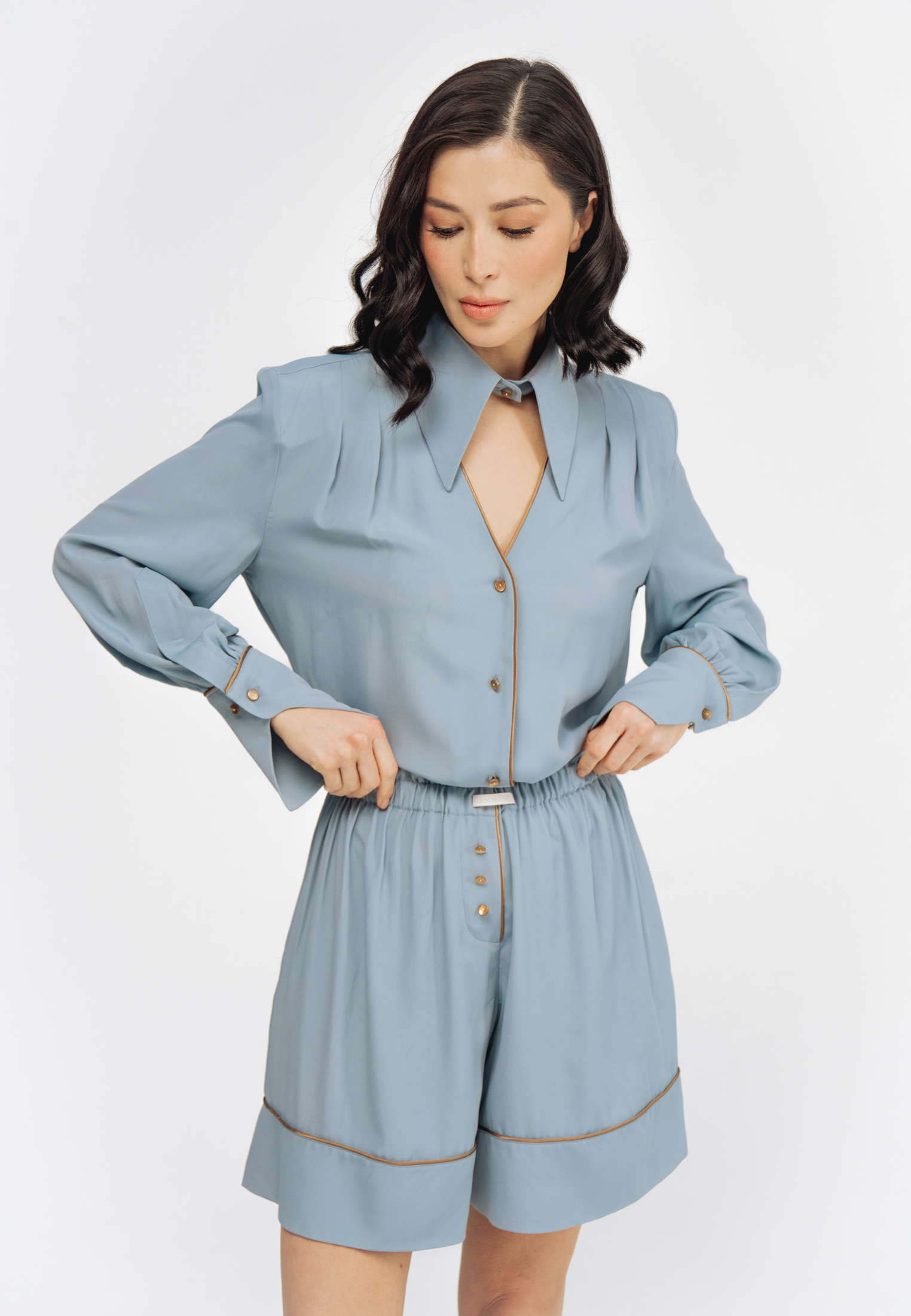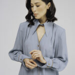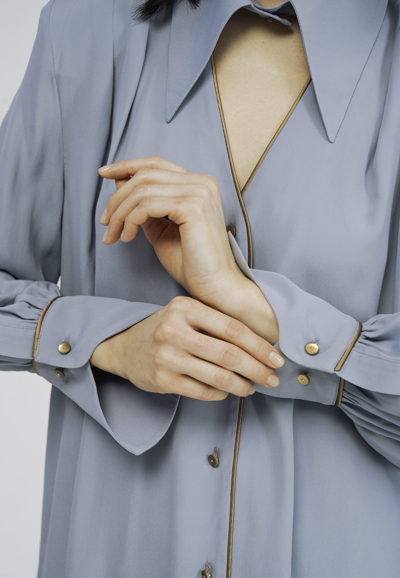 Модель свободного силуэта с длинными рукавами, дизайнерским отложным воротником и застежкой на пуговицы. Специальные разрезы на манжетах придают образу особый шик. Коричневая окантовка подчеркивает детали кроя.