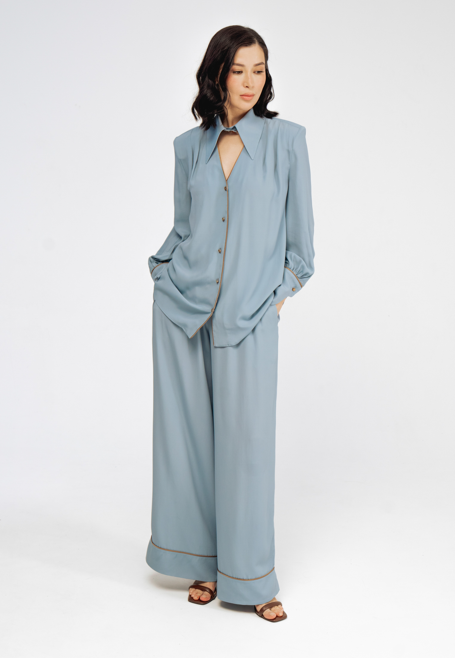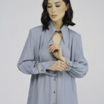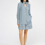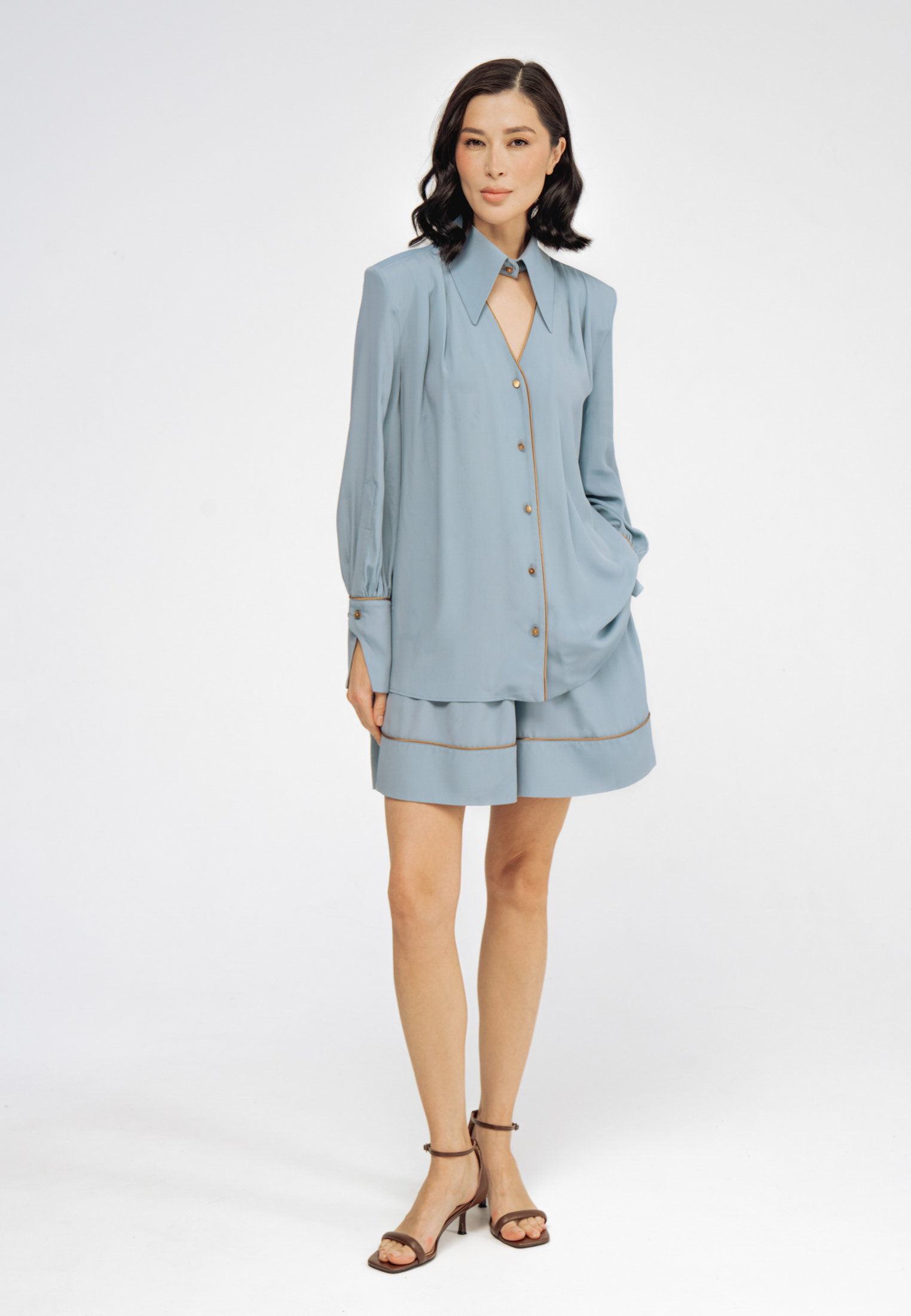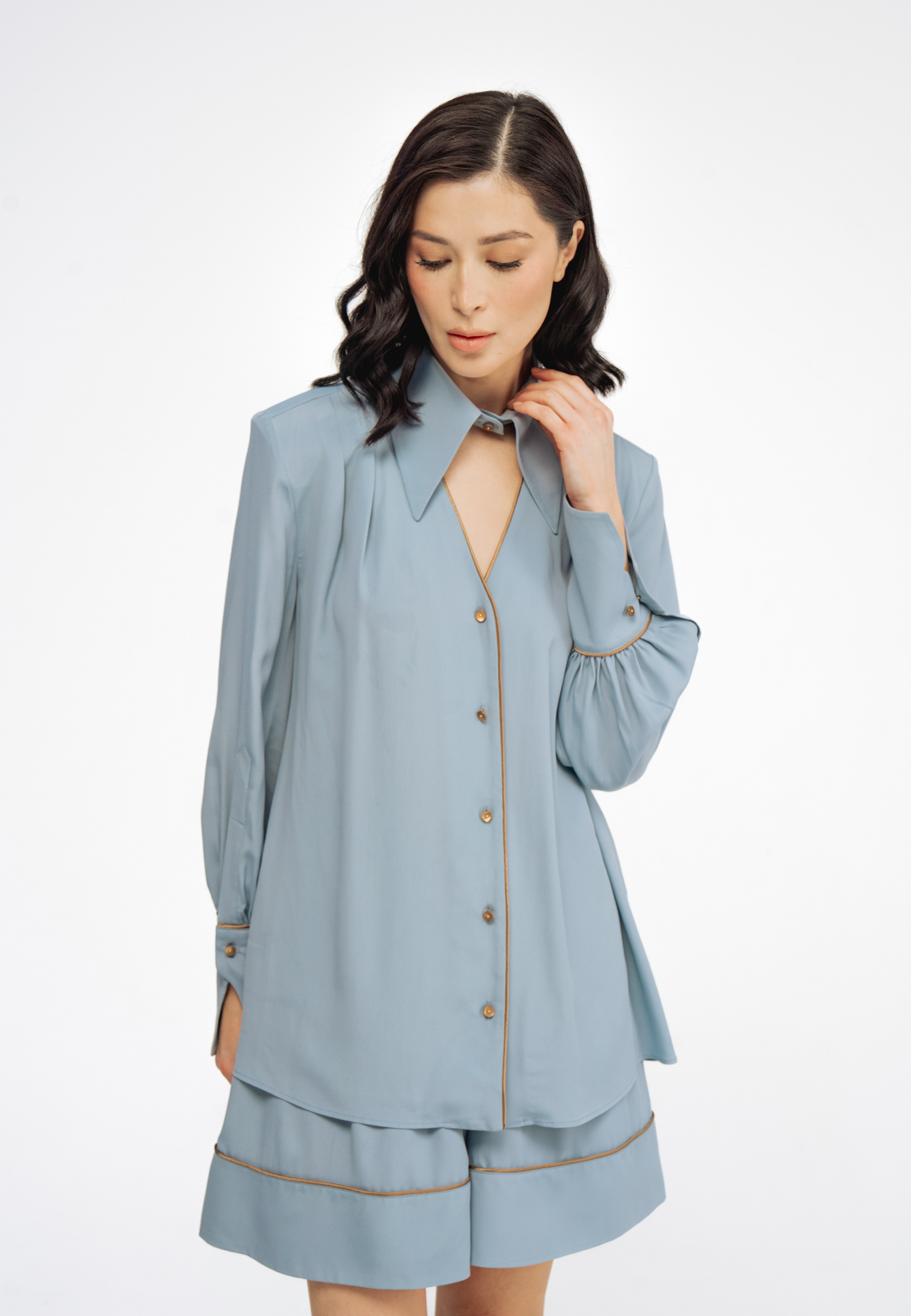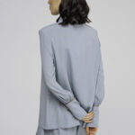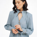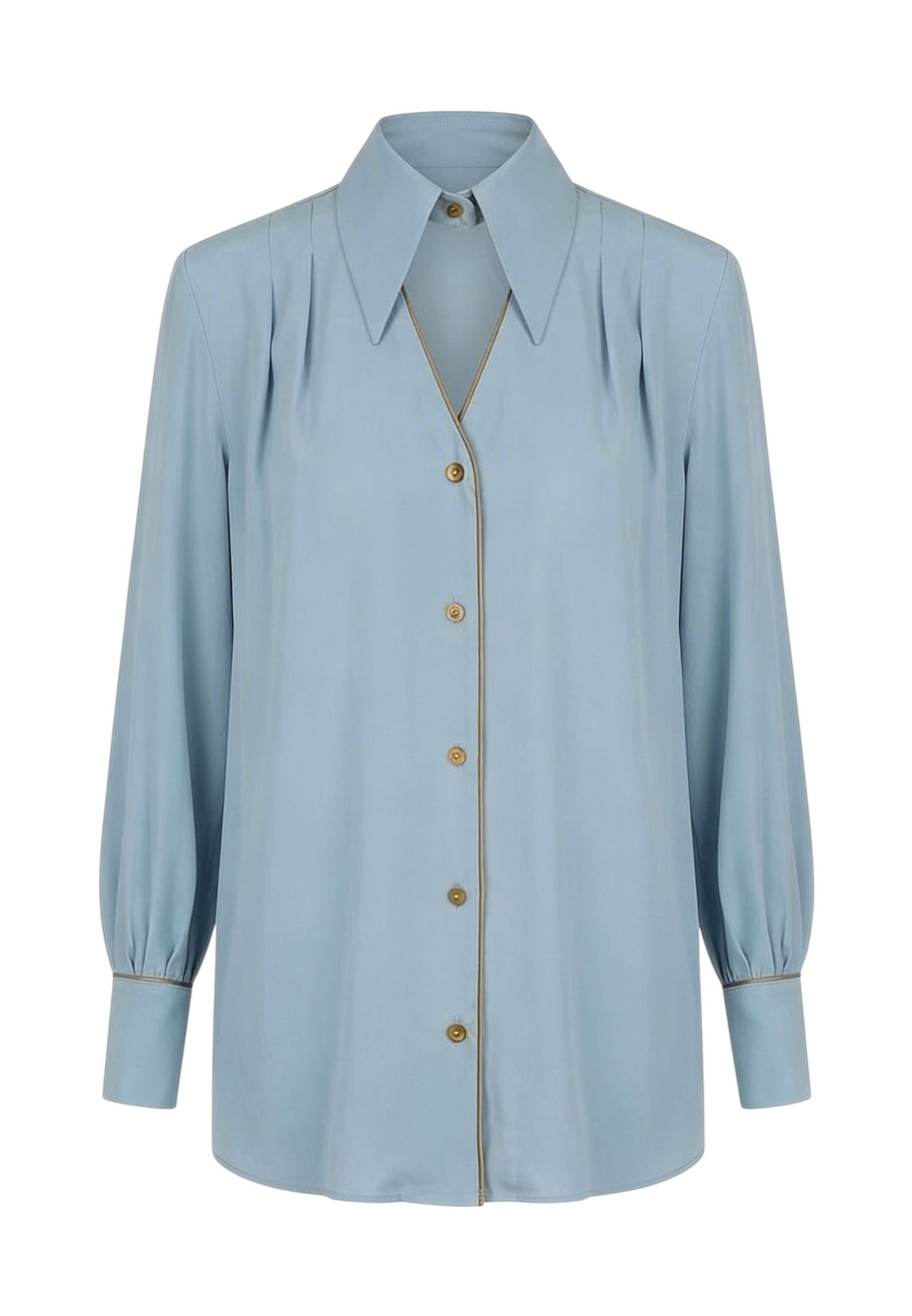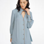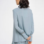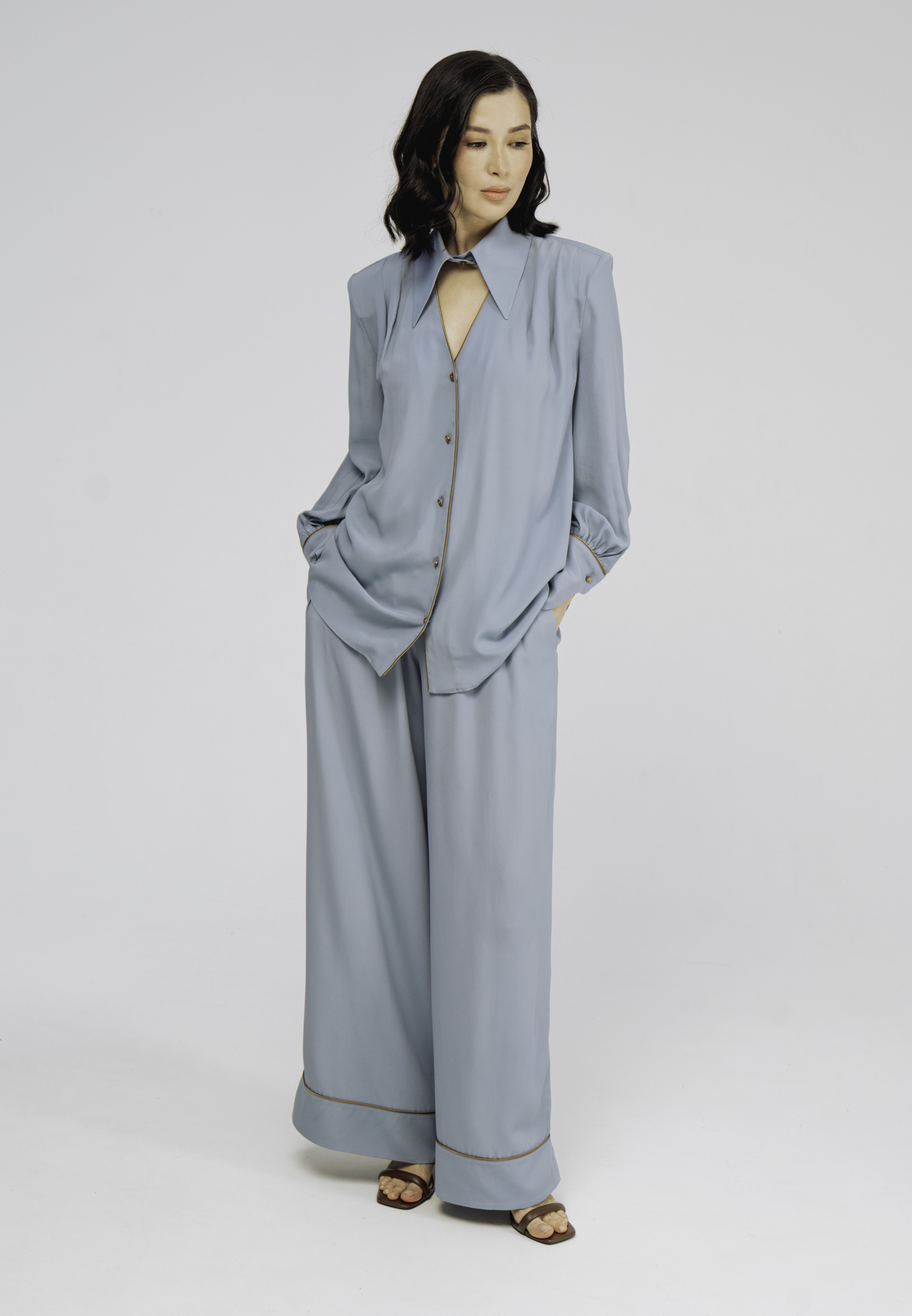 Модель свободного силуэта с длинными рукавами, дизайнерским отложным воротником и застежкой на пуговицы. Специальные разрезы на манжетах придают образу особый шик. Коричневая окантовка подчеркивает детали кроя.