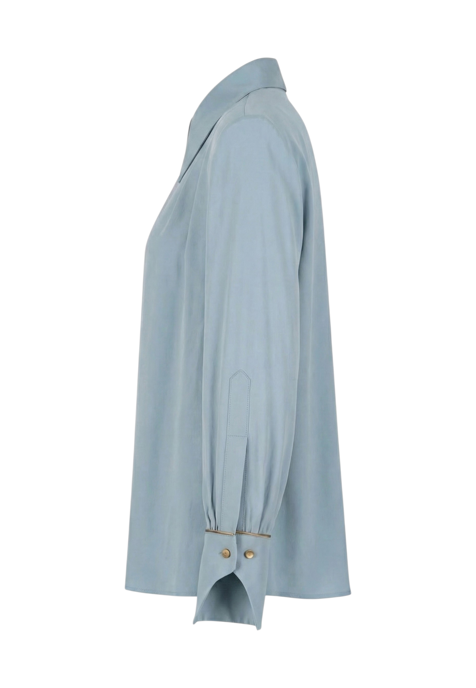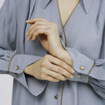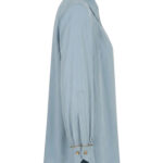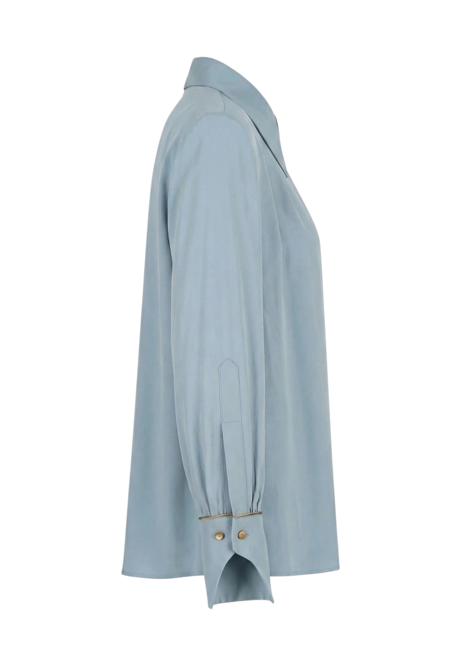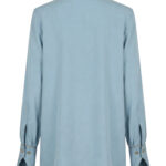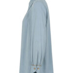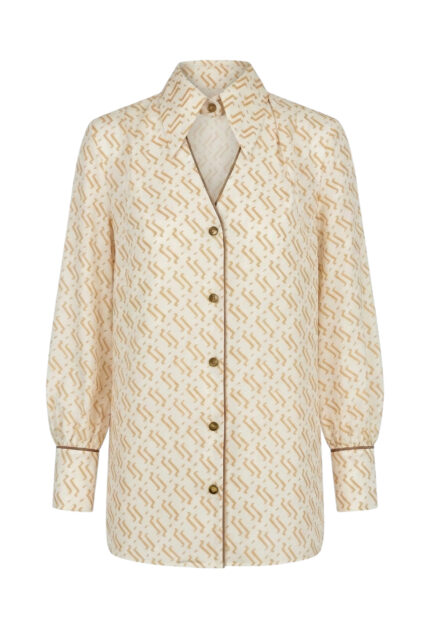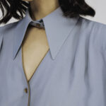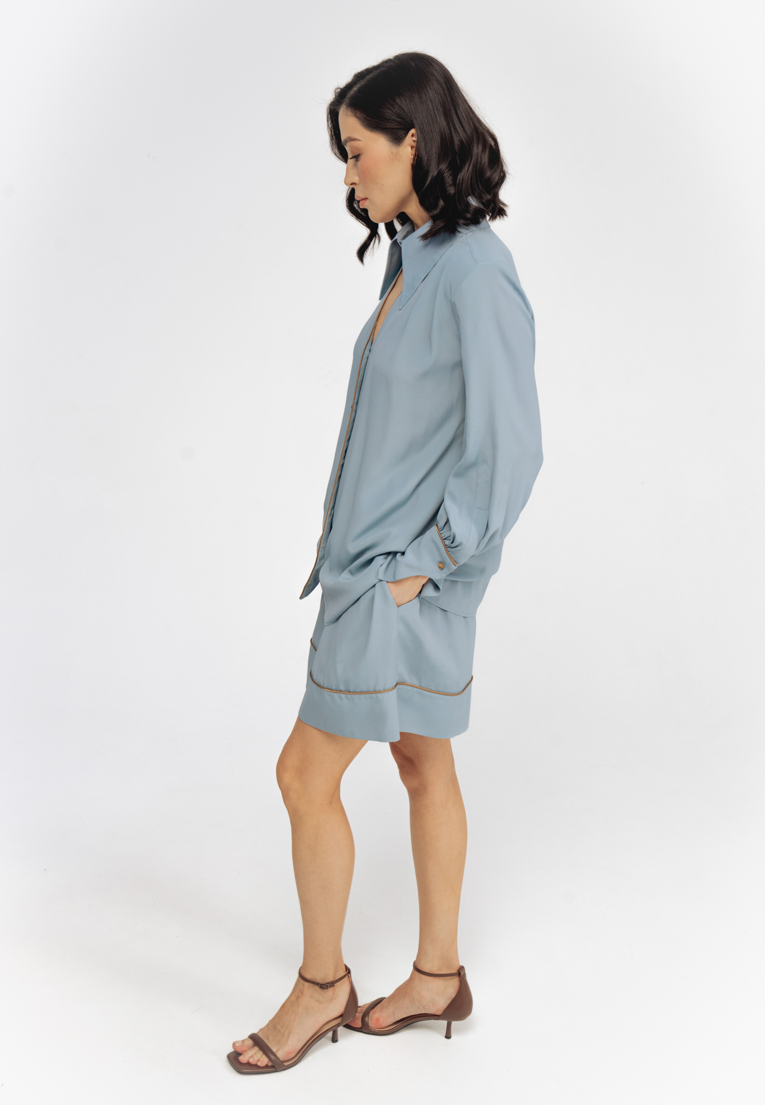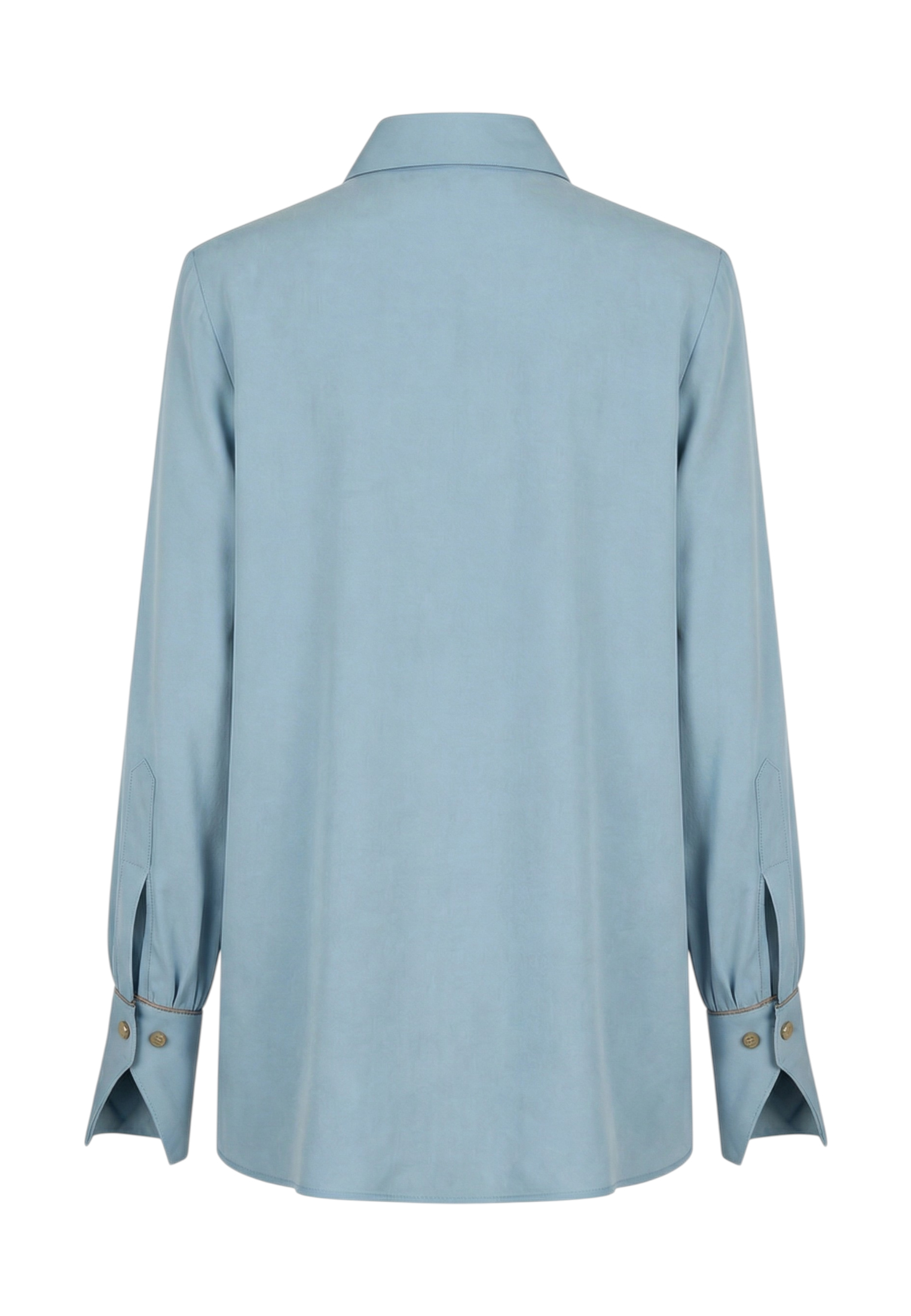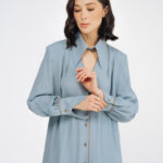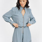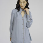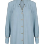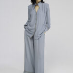 Модель свободного силуэта с длинными рукавами, дизайнерским отложным воротником и застежкой на пуговицы. Специальные разрезы на манжетах придают образу особый шик. Коричневая окантовка подчеркивает детали кроя.