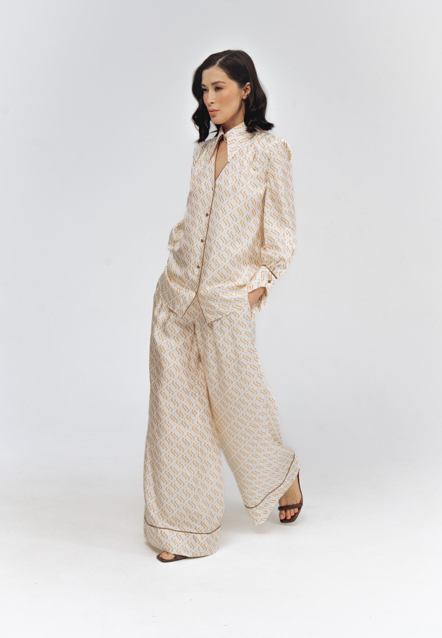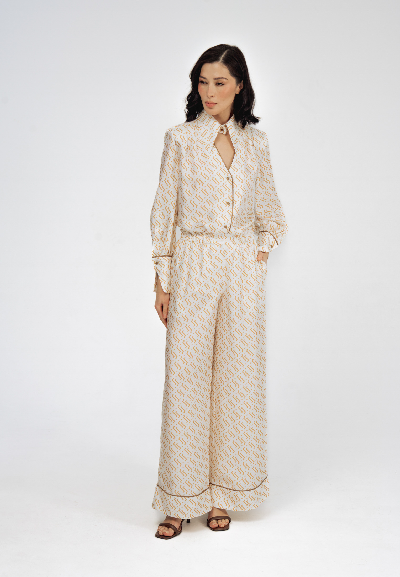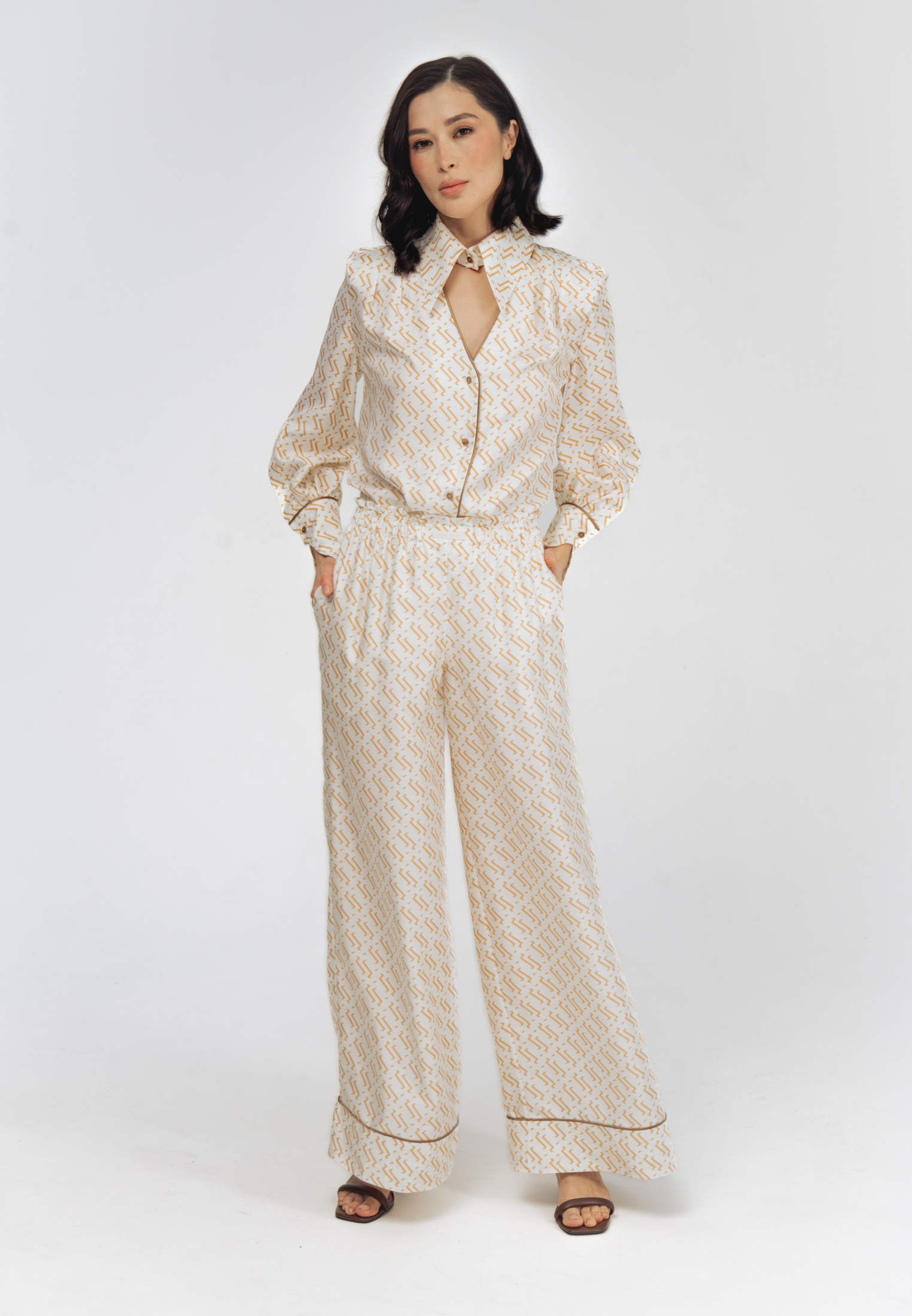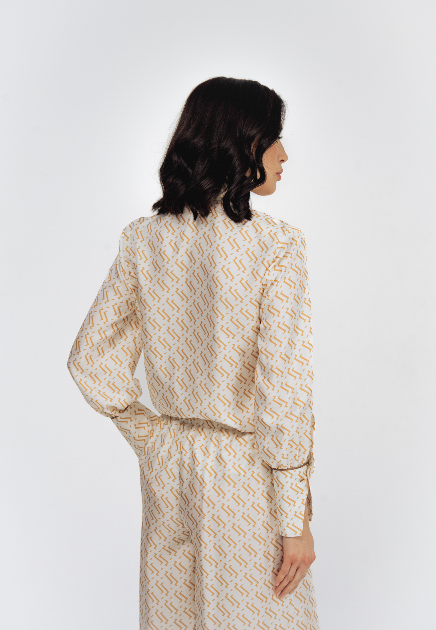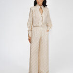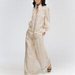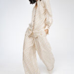 Модель свободного кроя с эластичным поясом и прорезными карманами. Комплектуется как самостоятельный элемент гардероба или вместе с блузой из этого же материала в качестве костюма.