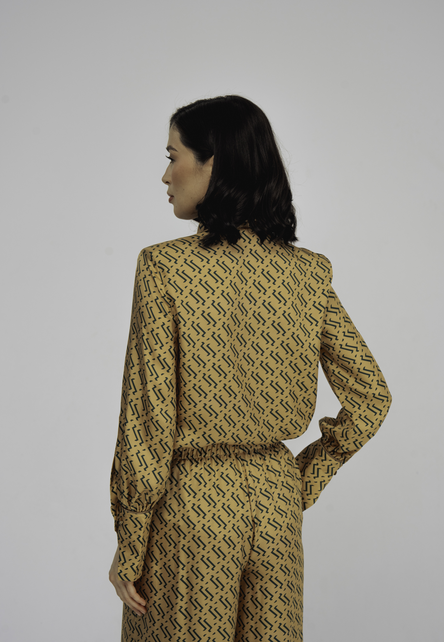 Модель свободного кроя с эластичным поясом и прорезными карманами. Комплектуется как самостоятельный элемент гардероба или вместе с блузой из этого же материала в качестве костюма.