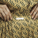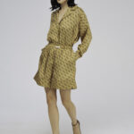 Модель свободного кроя с эластичным поясом с, длинной выше колен, прорезными карманами. Коричневая окантовка подчеркивает детали кроя. Комплектуются ак самостоятельный элемент гардероба или вместе с блузой из этого же материала в качестве костюма.