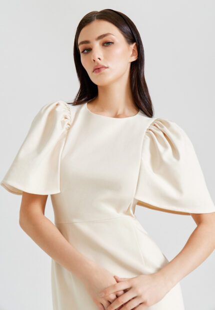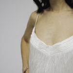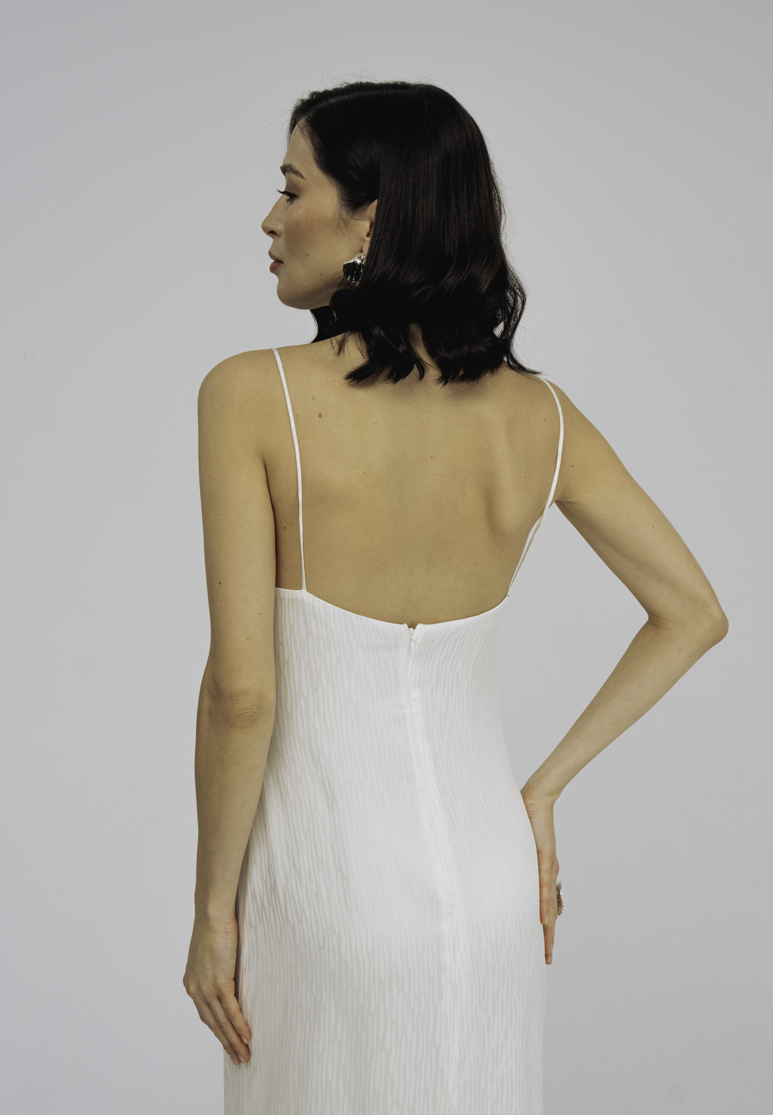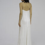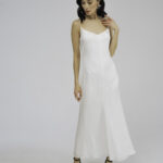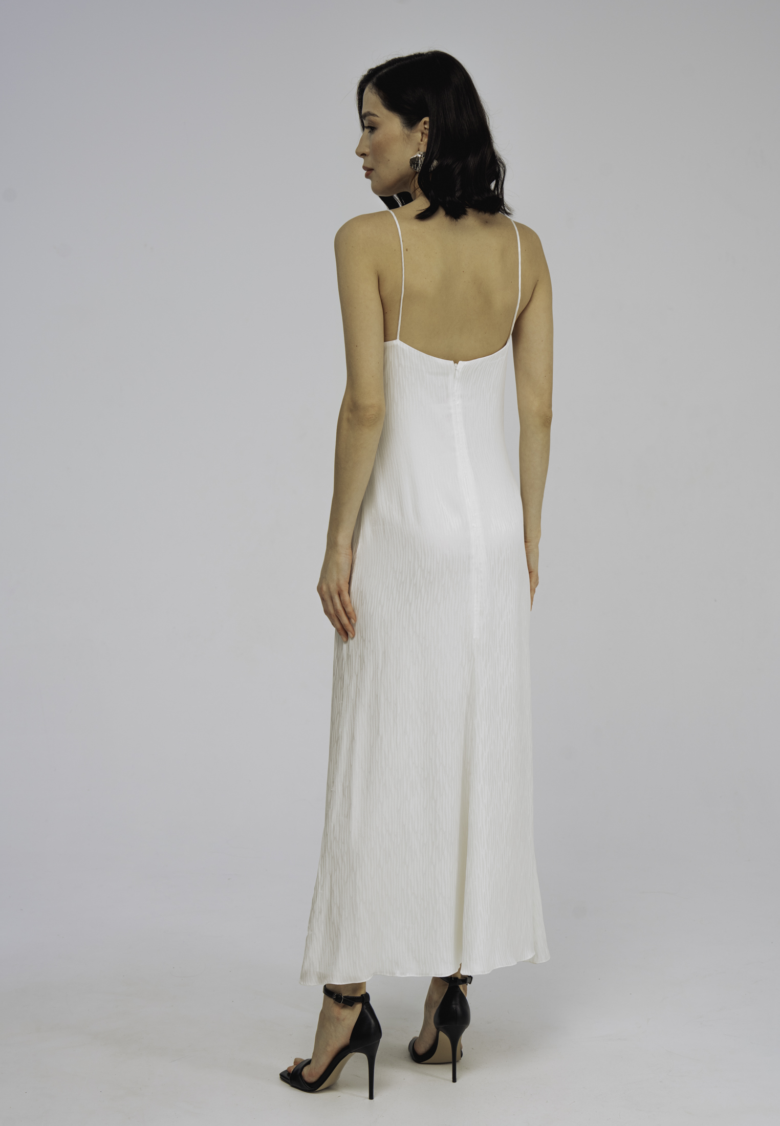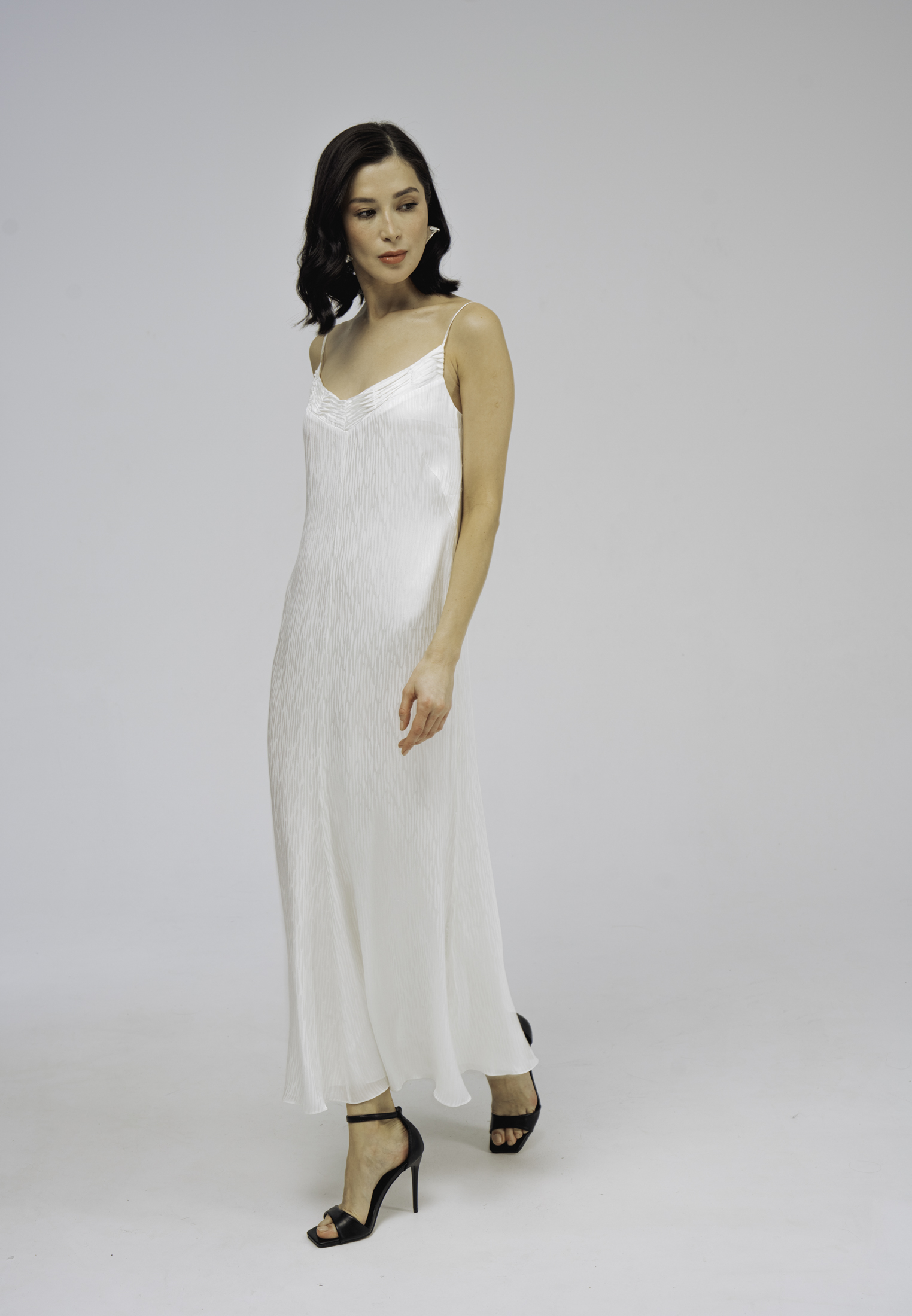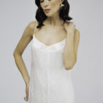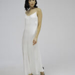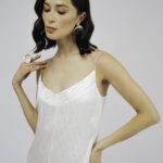 Модель полуприлегающего силуэта, длиной до середины голени, тонкими регулируемыми бретелями и застежкой на молнию на спинке. Аппликация из шелковых волн по линии декольте и жаккардовый узор придаютобразу особую лёгкость и утонченность.