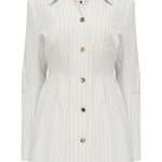 Бежевое платье-рубашка в полоску из смеси хлопка с вискозой.