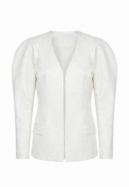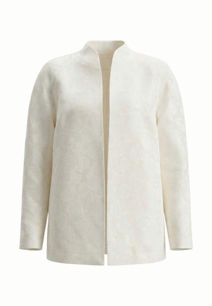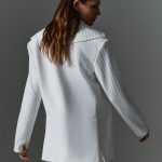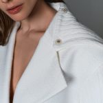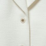 Жакет из твида со съемным воротником гюйс, имеет удлинённый рукав и фальш-карманы. Фурнитура декорирована металлическими элементами золотистого оттенка.